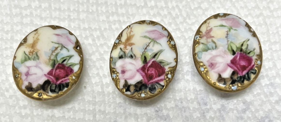 Antique Porcelain Hand Painted Rose Victorian Floral Flowers Gold Accents Oval Stud Button Approx. 1" long and 7/8" wide. Painted roses flowers and gold gilt accents in very good condition. No damage to porcelain stud button.