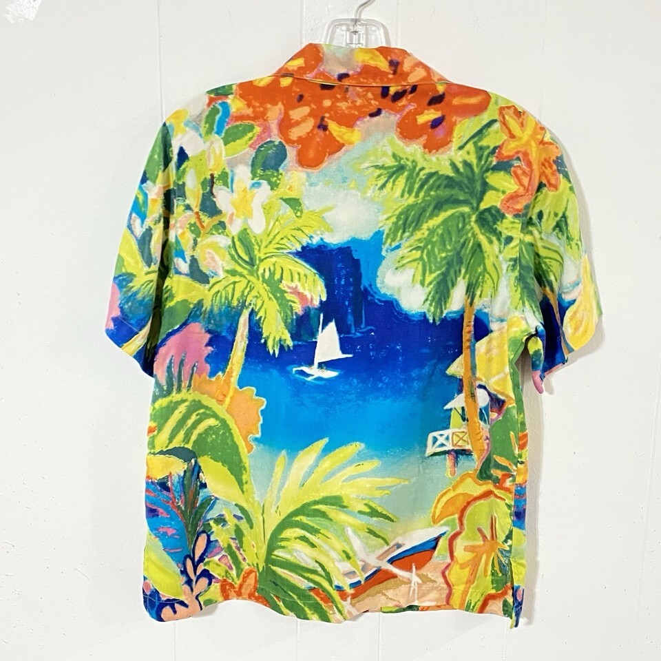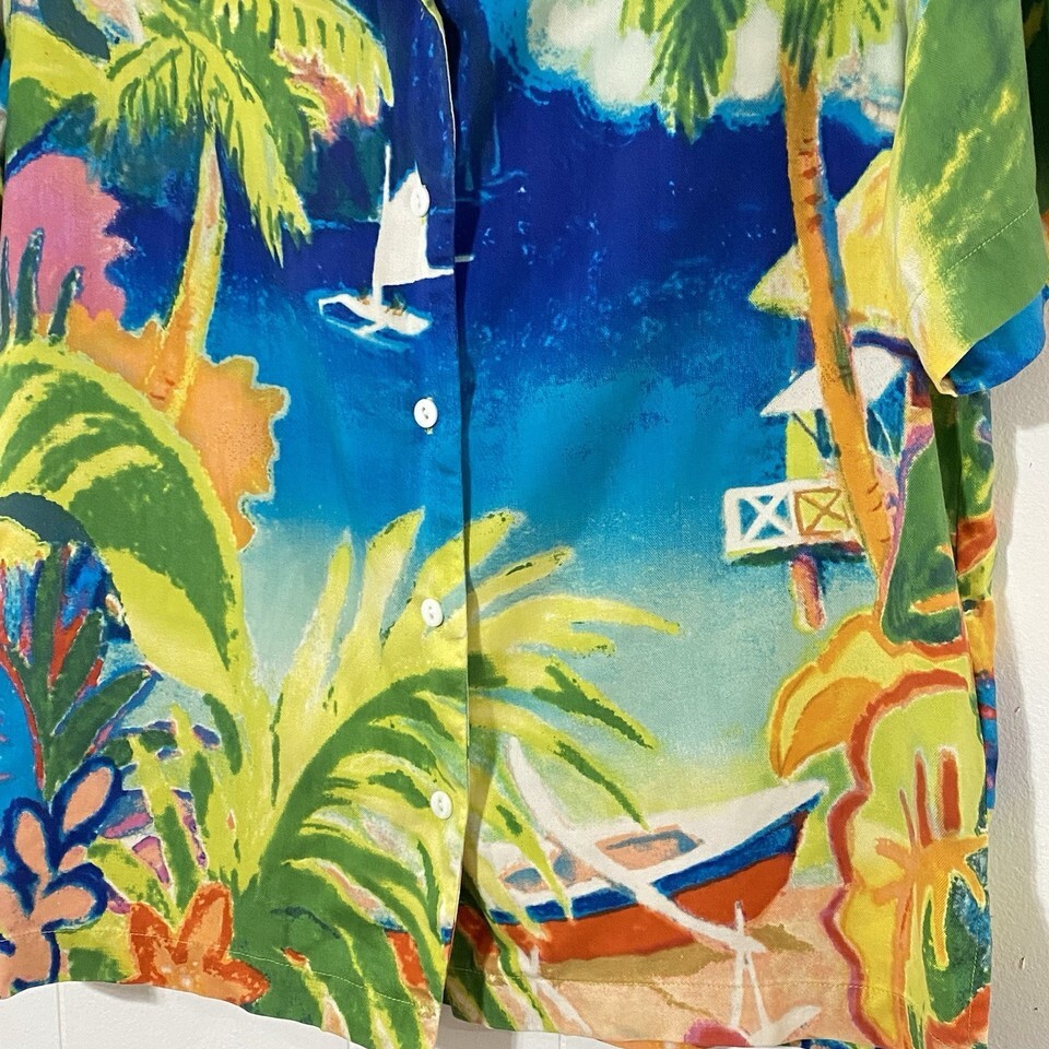 Michael Leu Art to Wear 100% SILK Shirt S Hawaiian Shirt BEACH Boat Watercolor