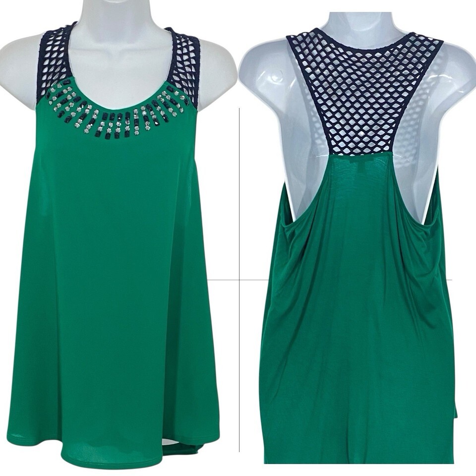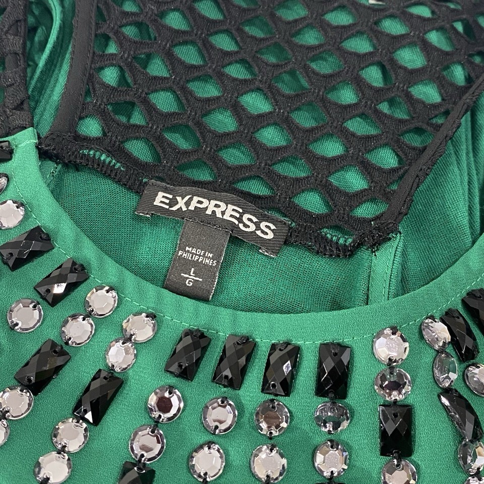 EXPRESS Green Halter BLING Top L Black MESH Tunic Rhinestones Racerback FLOWY