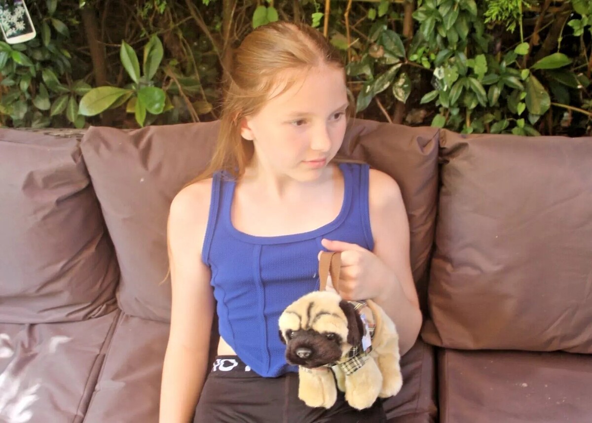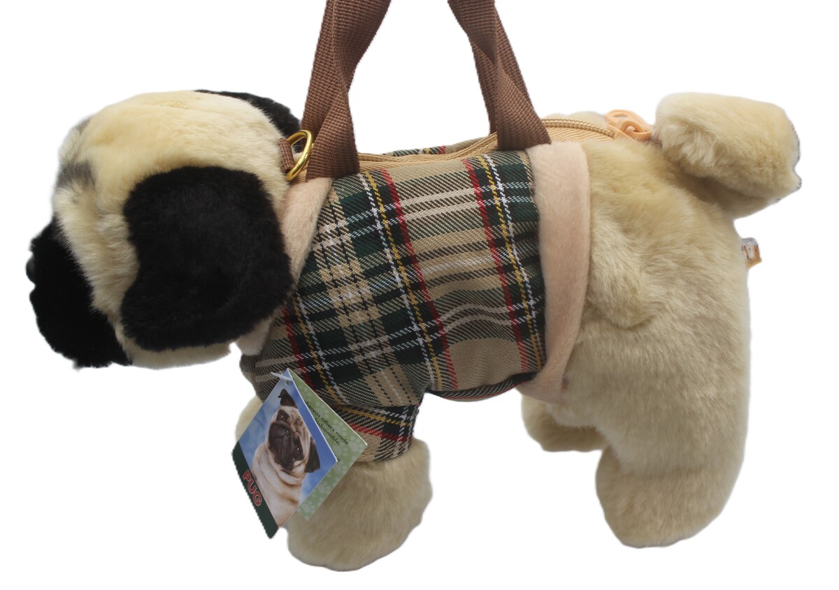 Pug shaped shoulder or hand bag fitted with a tartan coat