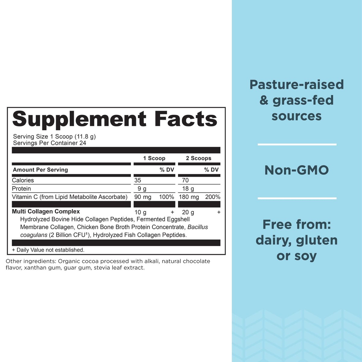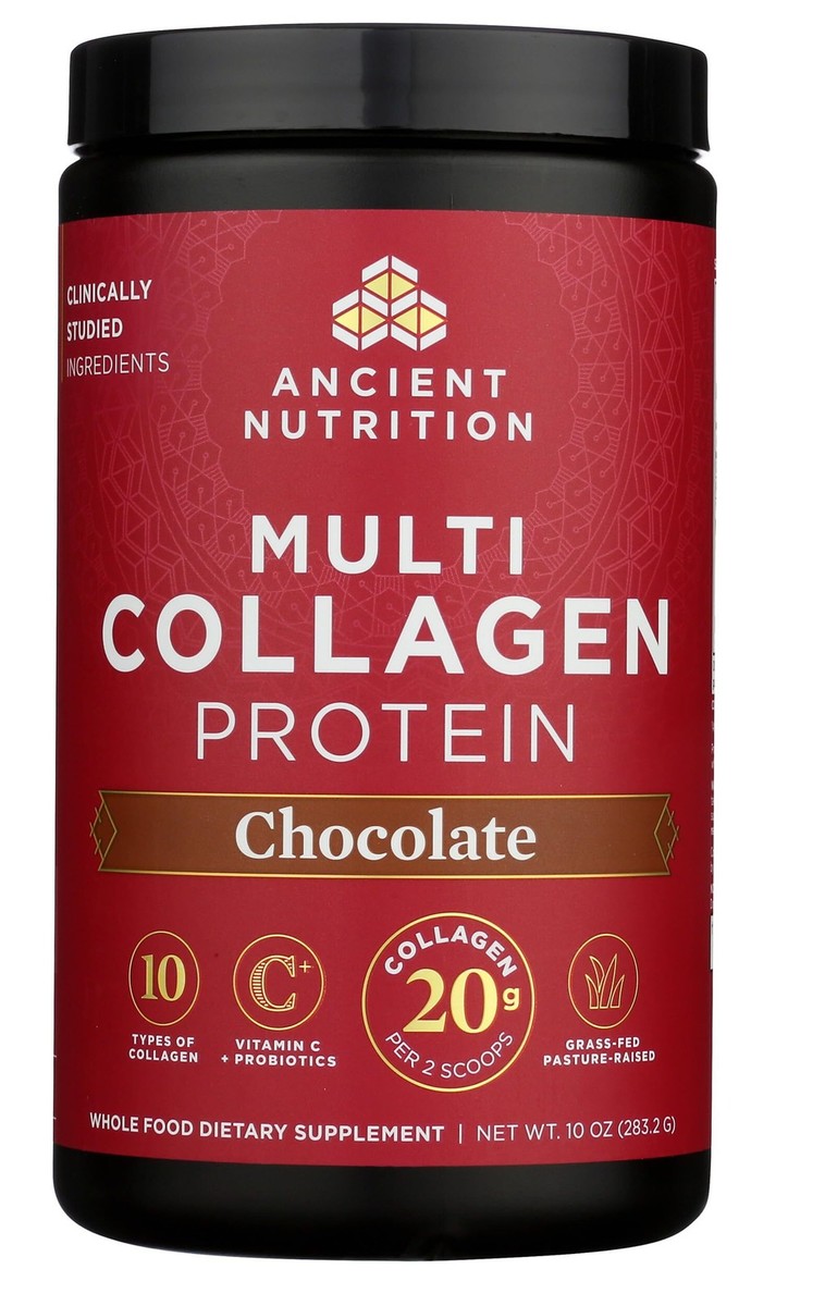 Expiration date of 03/2028 ? You will receive (1) tub of Multi Collagen Protein Powder, Chocolate, 24 servings ? BURSTING WITH BENEFITS - Every scoop features hydrolyzed collagen types I, II, III, V, and X from 4 food sources (Beef, Chicken, Fish and Eggshell Membrane). Our collagen powder is Non-GMO, grass fed and pasture-raised, made without hormones, cage free and cruelty free and provides a wide variety of health benefits including supporting healthy hair, skin, nails and gut support. Available in single serve, unflavored, vanilla, chocolate, cucumber lime, strawberry lemonade and cold brew flavors. ? EASY TO USE PACKED WITH NUTRIENTS: Two scoops of Ancient Nutrition Multi Collagen Protein powder provides 20g of collagen, 18g protein, 200% DV of Vitamin C and 4B CFU* probiotics (*at time of manufacture)! Add 2 scoops to any smoothie, protein shake, tea, coffee or your favorite drink for a daily boost of collagen protein and gut support. ? CLEAN PURE SOURCES ? Made without growth hormones and chemicals, our collagen protein powder is derived from chicken and eggs sourced exclusively from Midwest US farms, grass-fed and pasture-raised cows from South America and shellfish-free fish collagen derived from wild, cold water fish harvested in North America ? Our formulas are informed by ancient wisdom and backed by modern science; We use clinically-studied ingredients, backed by research and tested by accredited 3rd party labs for efficacy, GMP Certified for safety and all products are made in the U.S.A.