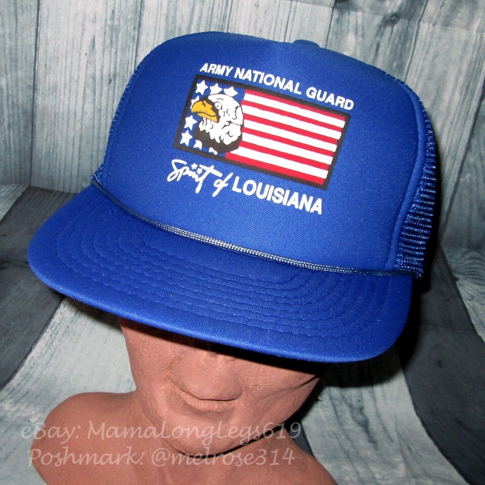 Vtg US Flag ARMY Ntl Guard Mesh Snapback Trucker Hat Spirit of Louisiana Eagle