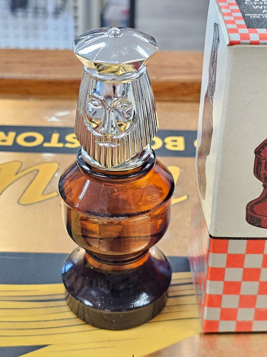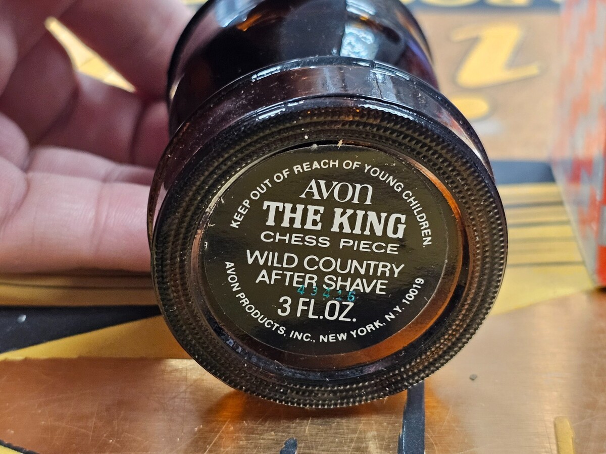 The product is a vintage Avon "The King" chess piece after shave, made in the United States. This collectible item is a 3 fl oz bottle of after shave, perfect for shaving enthusiasts or collectors of vintage shaving products. The unique design featuring a chess piece adds a touch of nostalgia to the product, making it a standout addition to any collection.