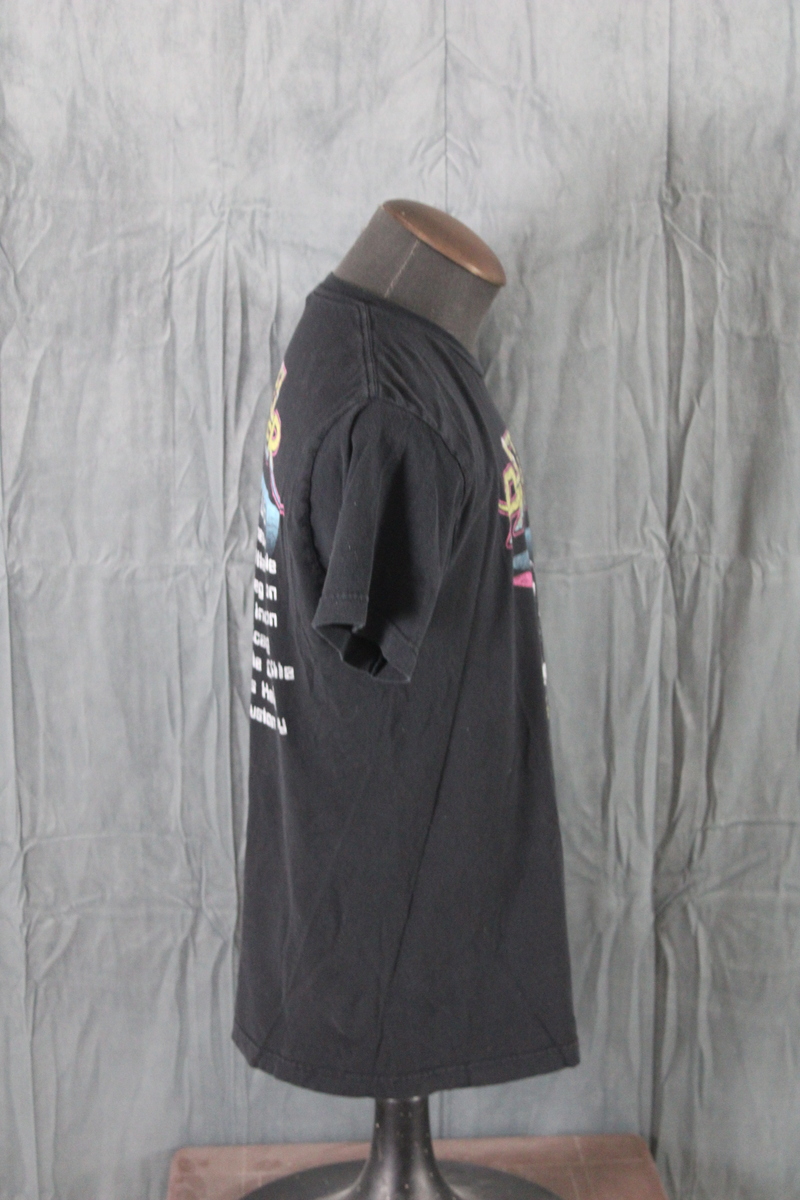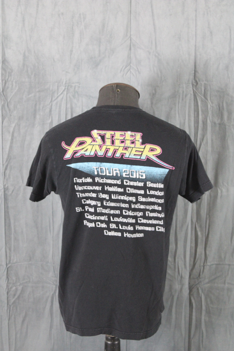 Up for sale is a band shirt. It is a Steel Panther shirt with a black base colour. The front of the shirt has a grpahic of the band screened on with the 2015 tour stops screened on the back. What a great shirt do not miss out on it.