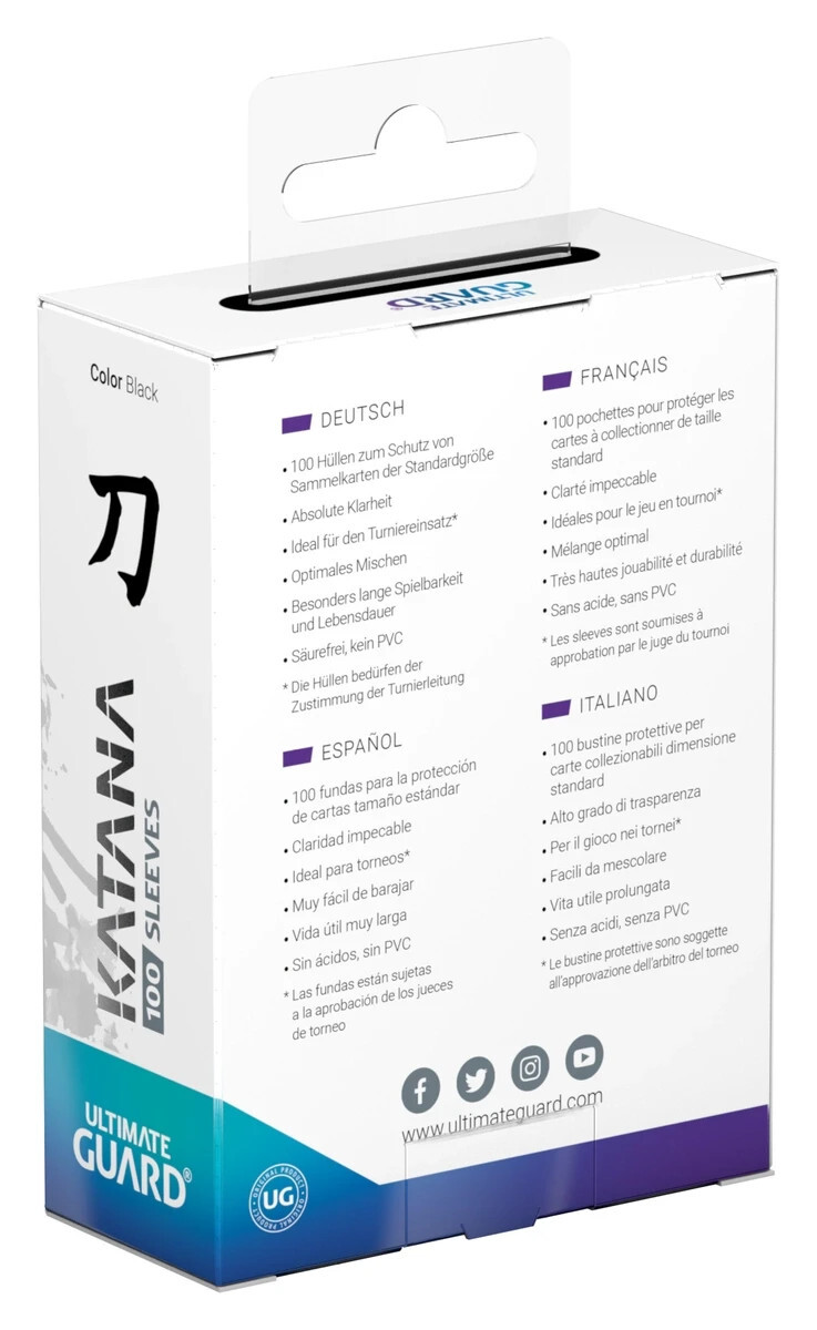 Ultimate Guard Katana Sleeves are the premium TCG card sleeves on the market. These high-quality protective sleeves for standard-size trading cards (Magic: The Gathering, Pokemon, Lorcana, One Piece, Flesh and Blood, etc.) are unrivaled in terms of shuffle feel and durability. With an ultra-clear front and an extra-opaque back, Ultimate Guard's Katana Sleeves meet the highest standards ? even for extensive, high-level tournament play.