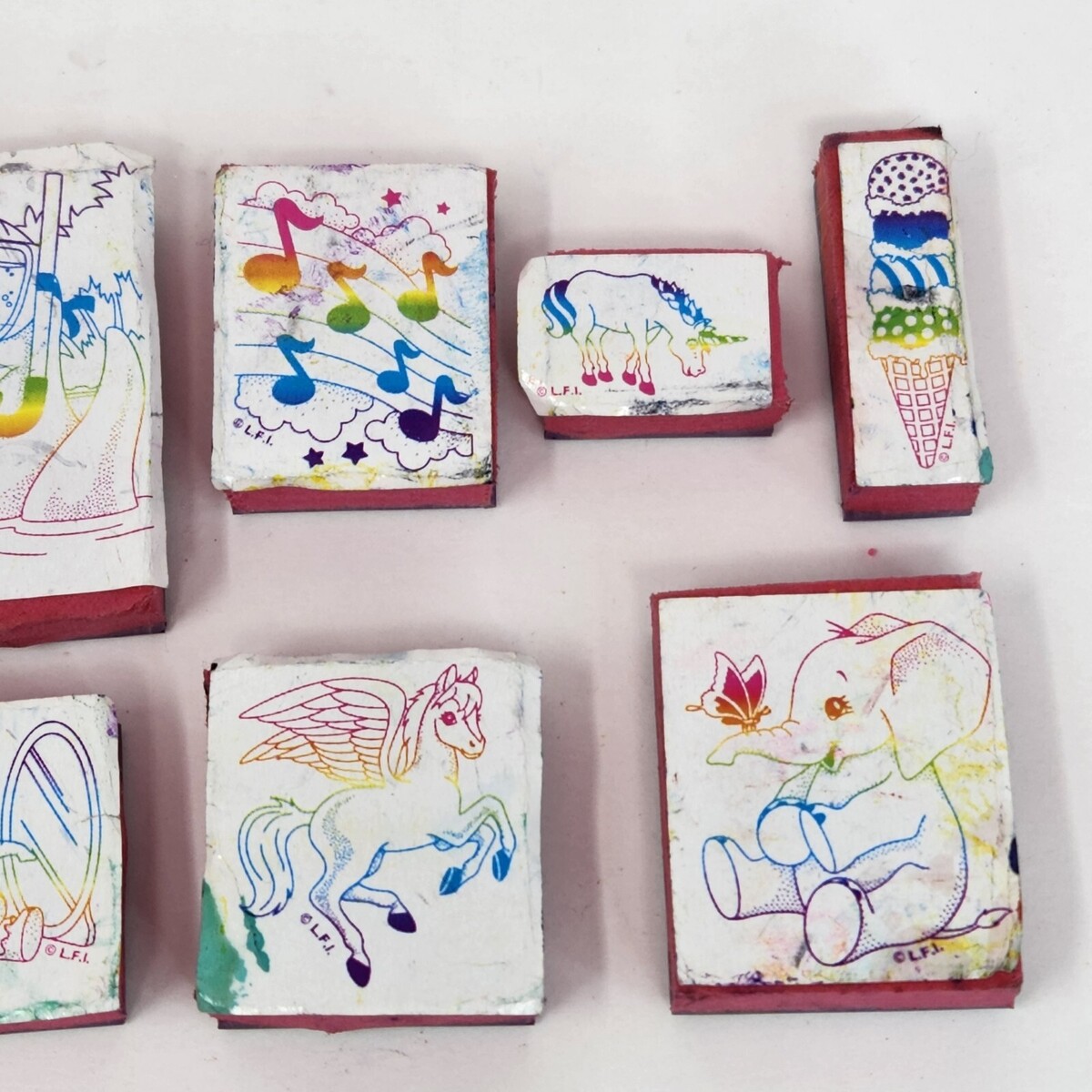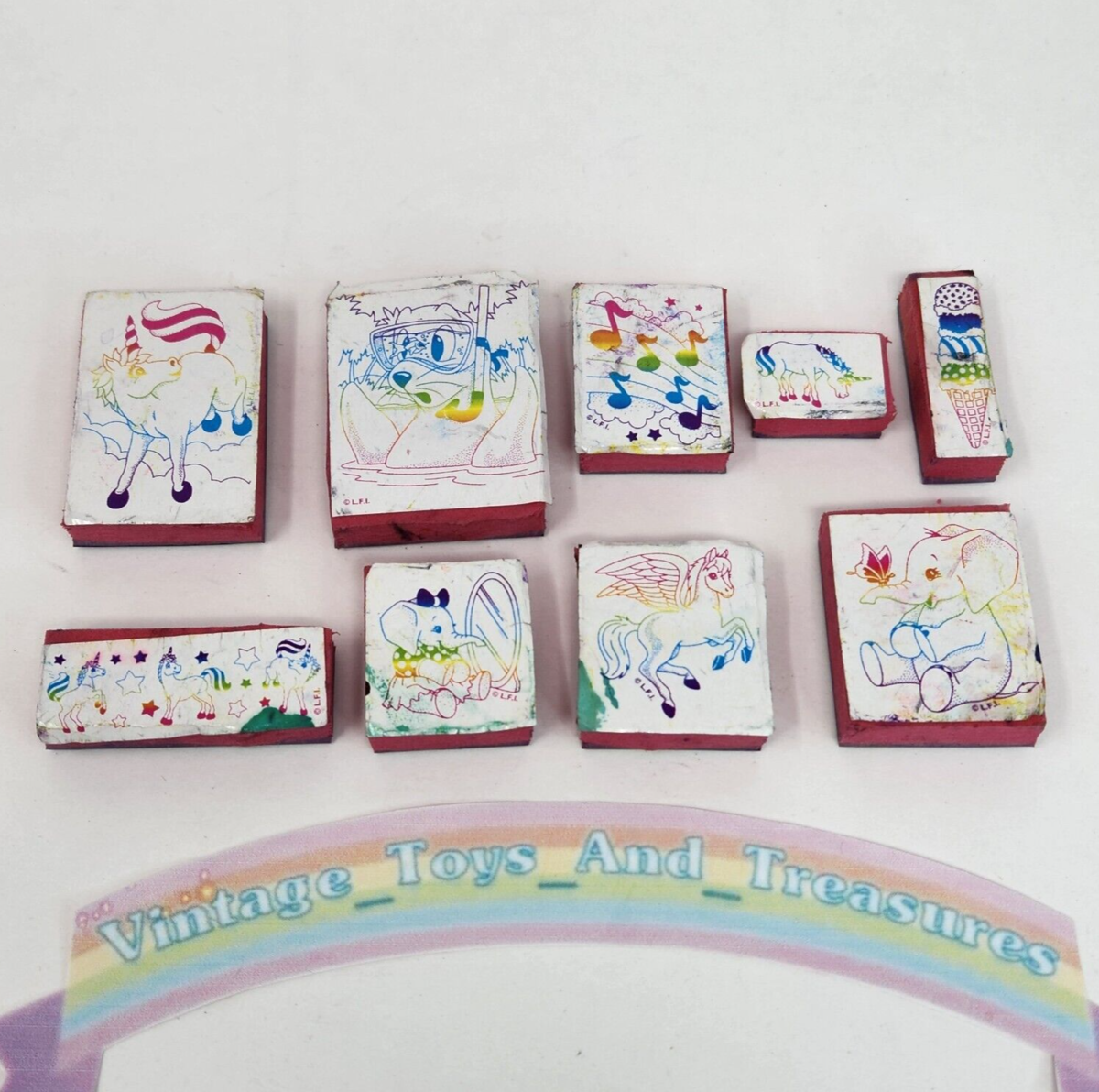 9 VINTAGE LISA FRANK STAMPS UNICORN ELEPHANT MUSIC NOTES ICE CREAM CONE SEAL