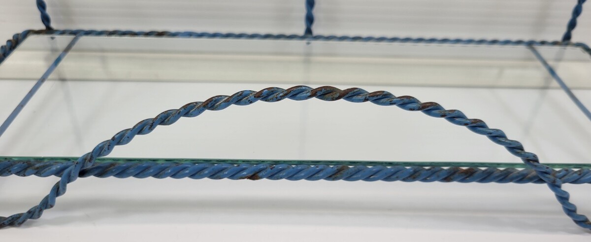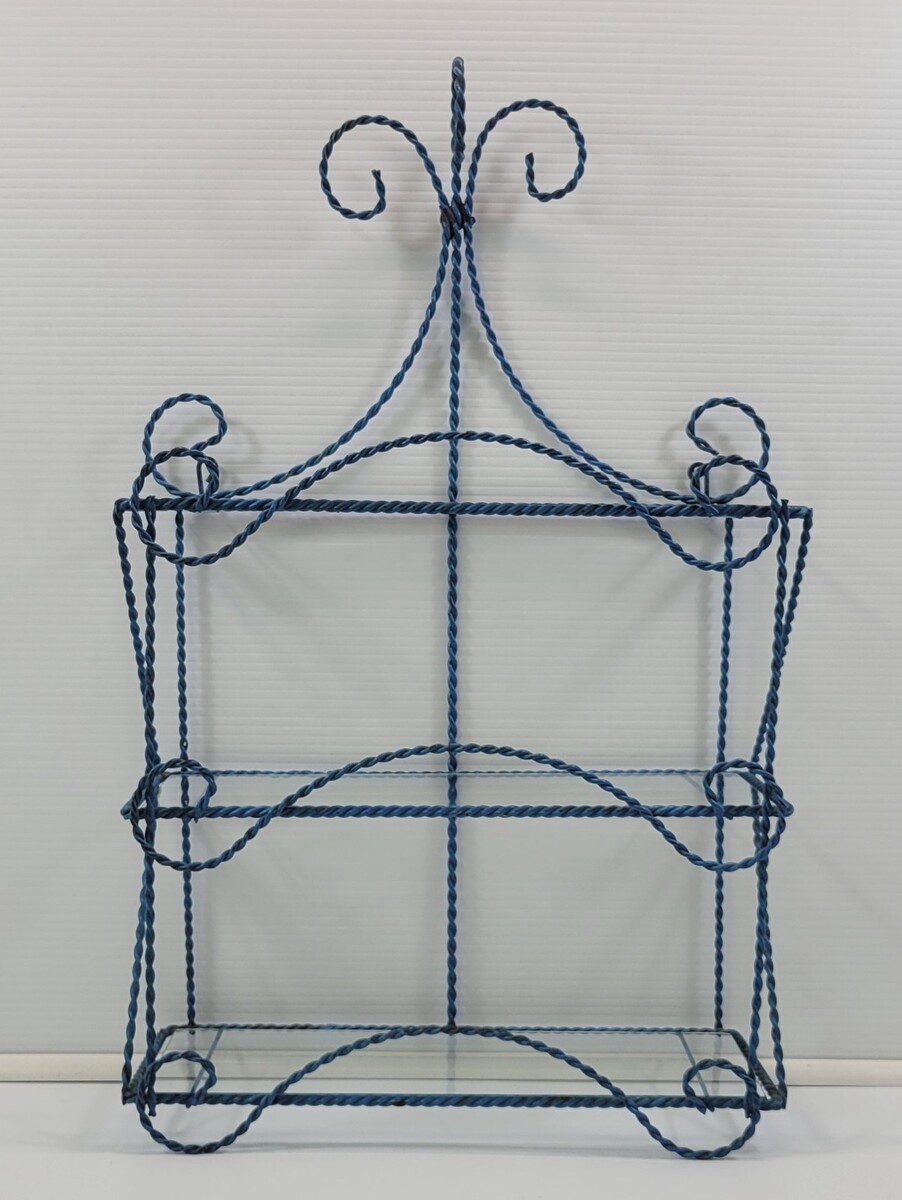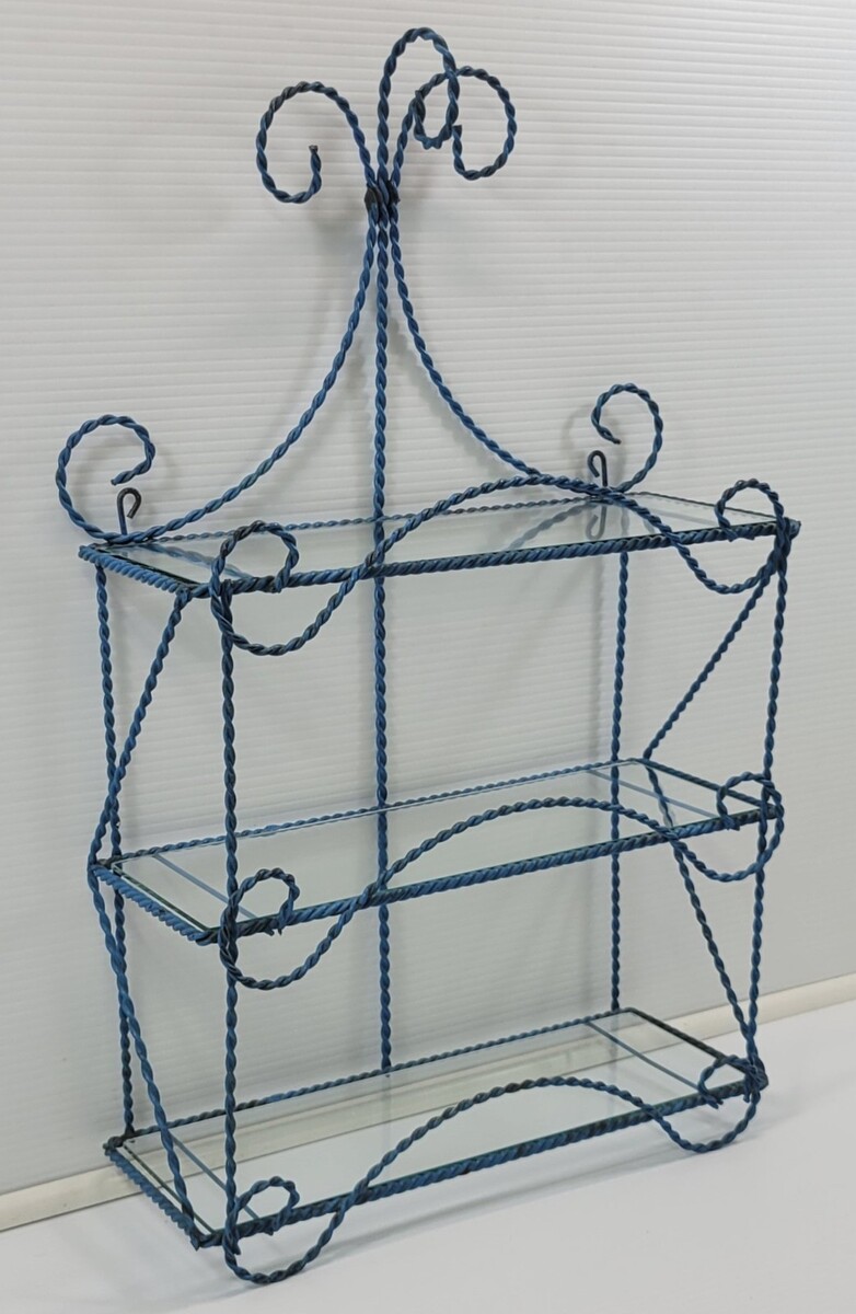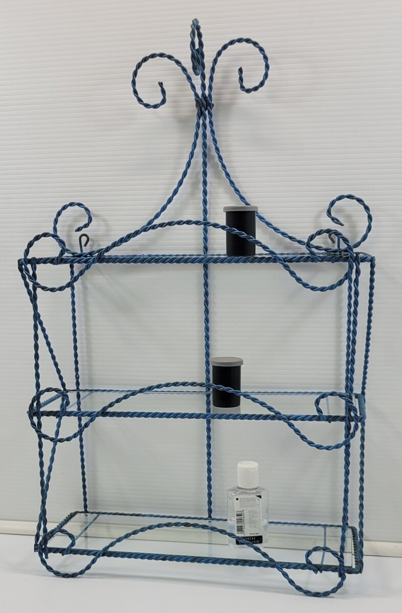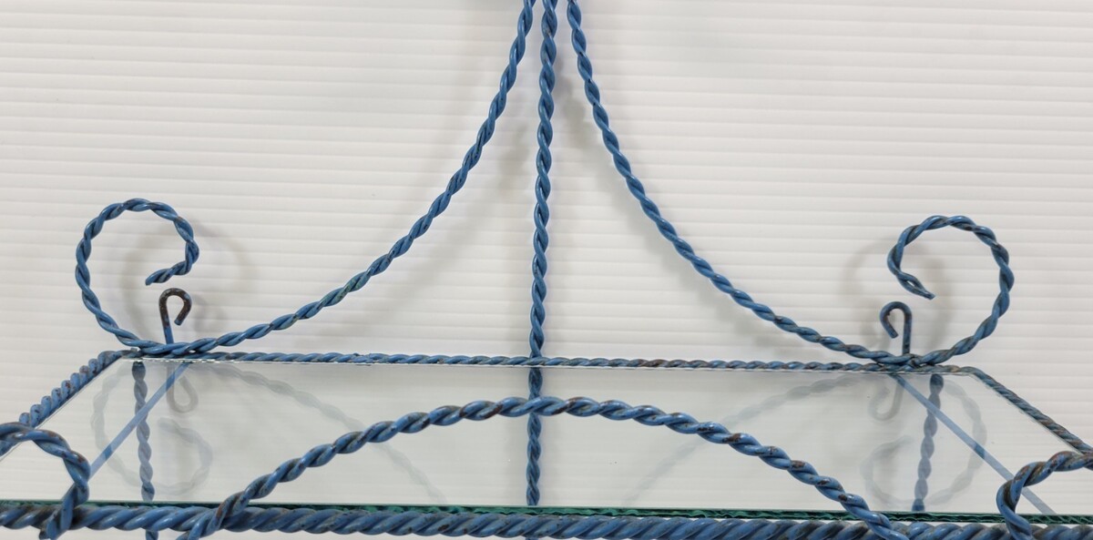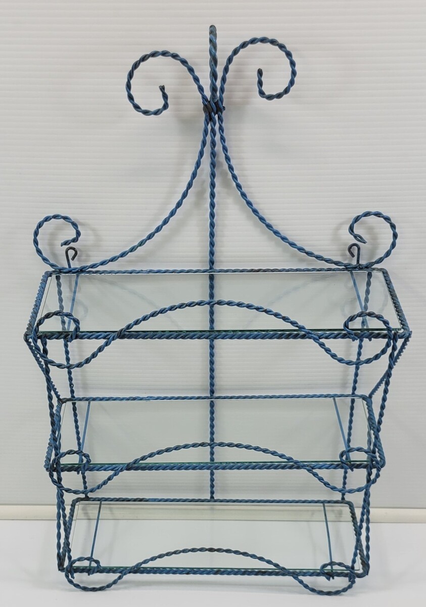*B) Vintage Handcrafted Twisted Metal Blue 3-Tier Glass Hanging Wall Shelf
