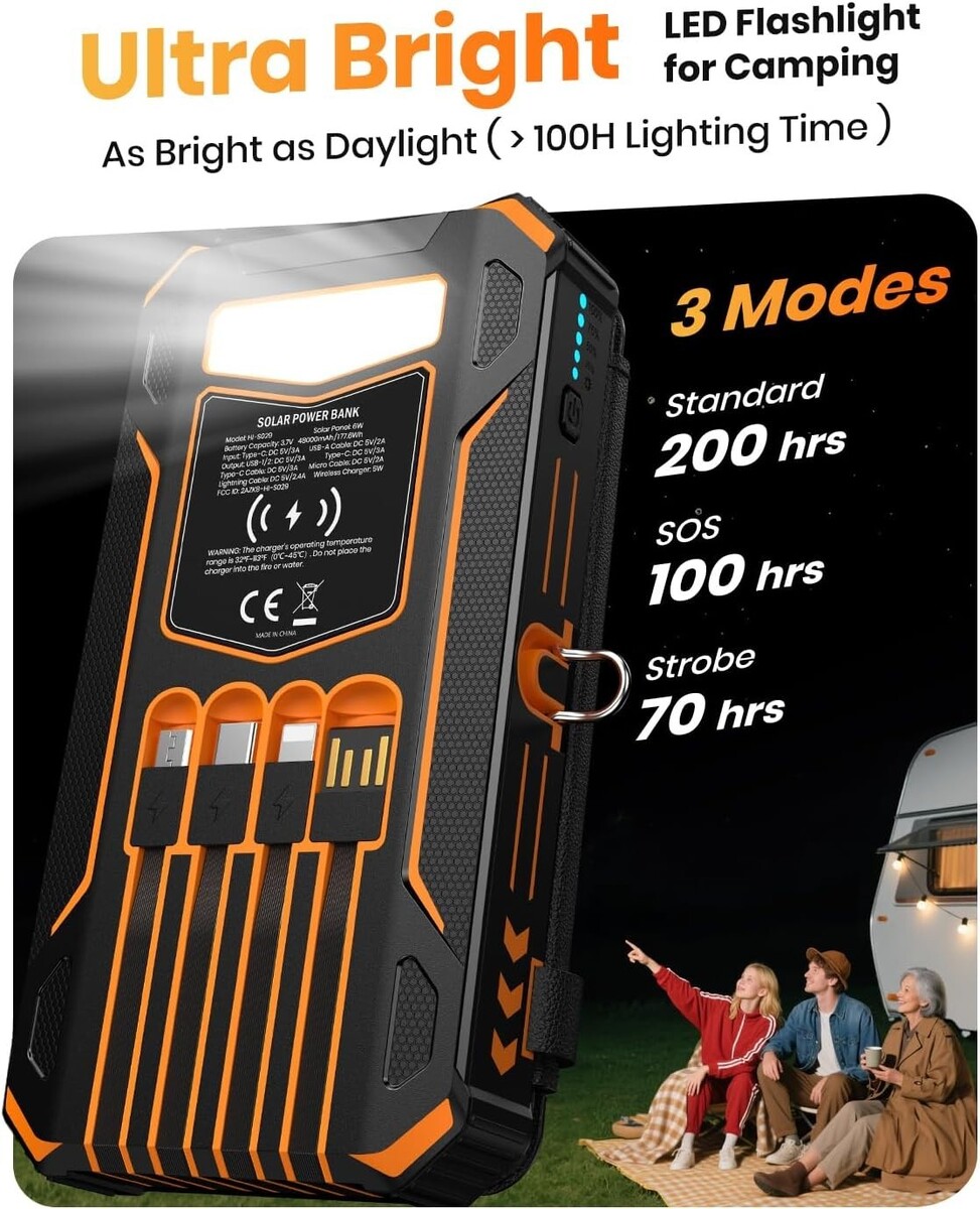 Massive 48000mAh Solar Power Bank: With a high-capacity lithium-polymer battery, enjoy enhanced safety and extended battery life?offering up to 80% more charging cycles than traditional batteries.