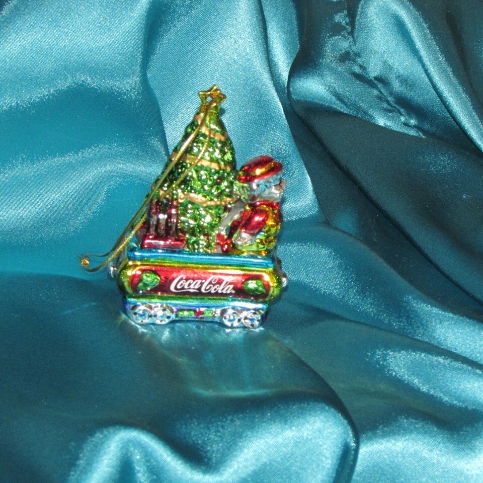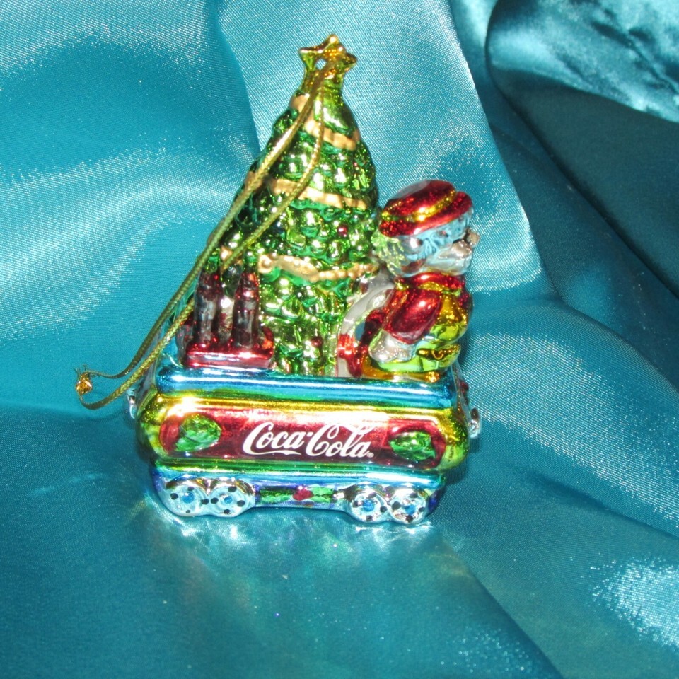 COCA COLA float ornament w/tree coke bottles caroler 1.25x2.25x3.25 in metal (D)