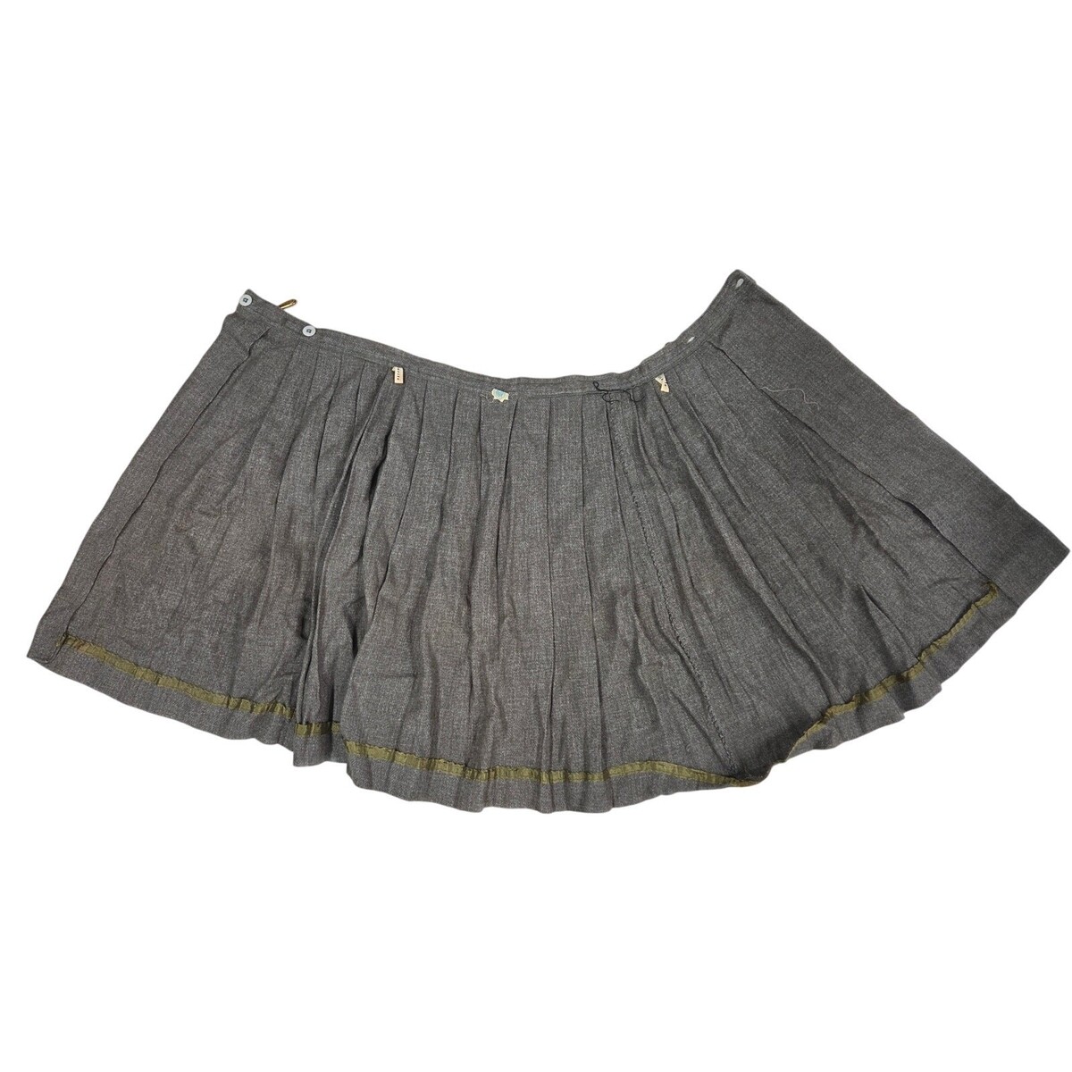 What you?ll love about this piece is its timeless WWII-era tailoring ? a soft gray-beige tweed pleated wrap skirt with two-button closure and brass clasp, made of wool and proudly bearing a mid-century union label. This is a classic 1940s wardrobe staple with structured elegance and enduring wearability.