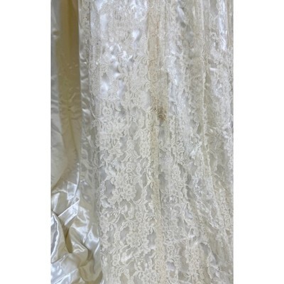 Ivory Skinner satin rayon, Chantilly lace applique, illusion yoke, lace-covered buttons.
