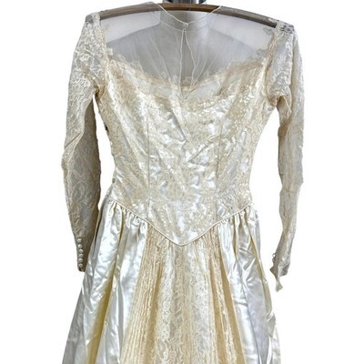 Hess Brothers was a luxury department store in Allentown, Pennsylvania, founded in 1897 and known for high-fashion imports and designer collaborations. Their wedding gowns were prized for elegance and refinement. This example, in Skinner satin (a prestigious American textile mill known for couture-level satins), reflects the romantic glamour of 1940s bridal fashion. Surviving examples in this condition with intact lace yoke and train are rare.