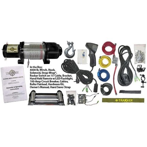 -- Trakker winches by Keeper Corporation are engineered and built to the highest standards, offering you superior reliability and strength. Designed for installation on UTVs, trailers, in the back of pickups, or in industrial settings, you can count on Trakker winches to help you find your way out of most any situation. Put their exceptional performance, durability, and power to use when you need to get the job done quickly and safely. Superior Power and Reliability at a Great Value Whether you're in the shop, on the track, or enjoying the great outdoors, you depend on your equipment to get through the day. With that in mind, Trakker provides superior performance at a great value. Designed for recreation, but built with full industrial-grade strength that you can rely on, Trakker winches are engineered to give you exceptional durability even under constant use. Their speed, reliable performance, and low amp draw make them ideal for the job site and garage where time means money. Trakker winches come in capacities ranging from 2,000 to 4,000 pounds to handle ATVs, UTVs, race car and utility trailers and other general purpose winching applications. Convenient Features for Off-Road and In-Shop Ease The Trakker KT4000 is the toughest winch in the line, and is ideal for trailer, UTV and general use. Its fast line speed is designed to do the job, stow the cable and then get you on your way quickly. The easy-grip hand-held remote gives you 15 feet of movement from the winch and load, plus it has a built-in high-intensity LED flashlight to assist you in making a secure connection and check the cable as it spools back onto the drum. The KT4000 also includes a separate removable rocker switch with a 15-foot cable and "Quick Clip" cradle for in-cab or on- handle mounting--perfect when operating snow plows or other accessories. The Hand Saver Strap attaches to the winch's hook, and makes it easy to manually pay out the wire rope when the freespool clutch is engaged. The KT4000 is also available in camouflage color, perfect for the outdoor enthusiast, sportsman and camo lover. Strength and Safety to Get the Job Done When you're out on the trail, or just in the shop, you want a winch that is strong enough to move your load. However, getting that load moved safely is always the primary concern. The KT4000C is equipped with 55 feet of 7/32" aircraft-grade galvanized wire rope that winds onto a sturdy drum-centric design. A 1.6 horsepower 12-volt DC motor and 3-stage planetary all-metal gear train provide excellent pulling speed and power. The dual mechanical and dynamic braking system is designed to stop and hold the fully loaded cable, keeping it where you need it until you are ready to move again. The KT4000 also has a built-in circuit breaker, protecting the winch and your equipment if a voltage change or short circuit should occur. Color-coded wiring and detailed instructions make do-it-yourself installation easy. How to choose a winch Choose a winch model with a capacity that is at least 1.5 times the weight of the vehicle you plan to pull. This assumes a rolling wheeled vehicle, in good condition, on a hard, flat, level surface. If you plan to drag a non-rolling load, choose a winch with at least twice the weight capacity. This will ensure that you will always be able to move the load, and guarantees a long life for your winch. What's In the Box? The Trakker KT4000 4,000-pound rated winch comes with the following: 55 feet of wire rope, one heavy-duty hook, one rocker switch with bracket on a 15-foot cable, one hand-held remote with LED flashlight, one solenoid, one 100-amp circuit breaker, one roller fairlead, the Hand Saver strap, a strap wrap, hardware kit, installation wiring and owners manual. Winch mount kit is not included. Product Description The KT4000 is ideal for UTV's, utility trailers, and general winch applications. It is packed with features essential for efficient and reliable operati