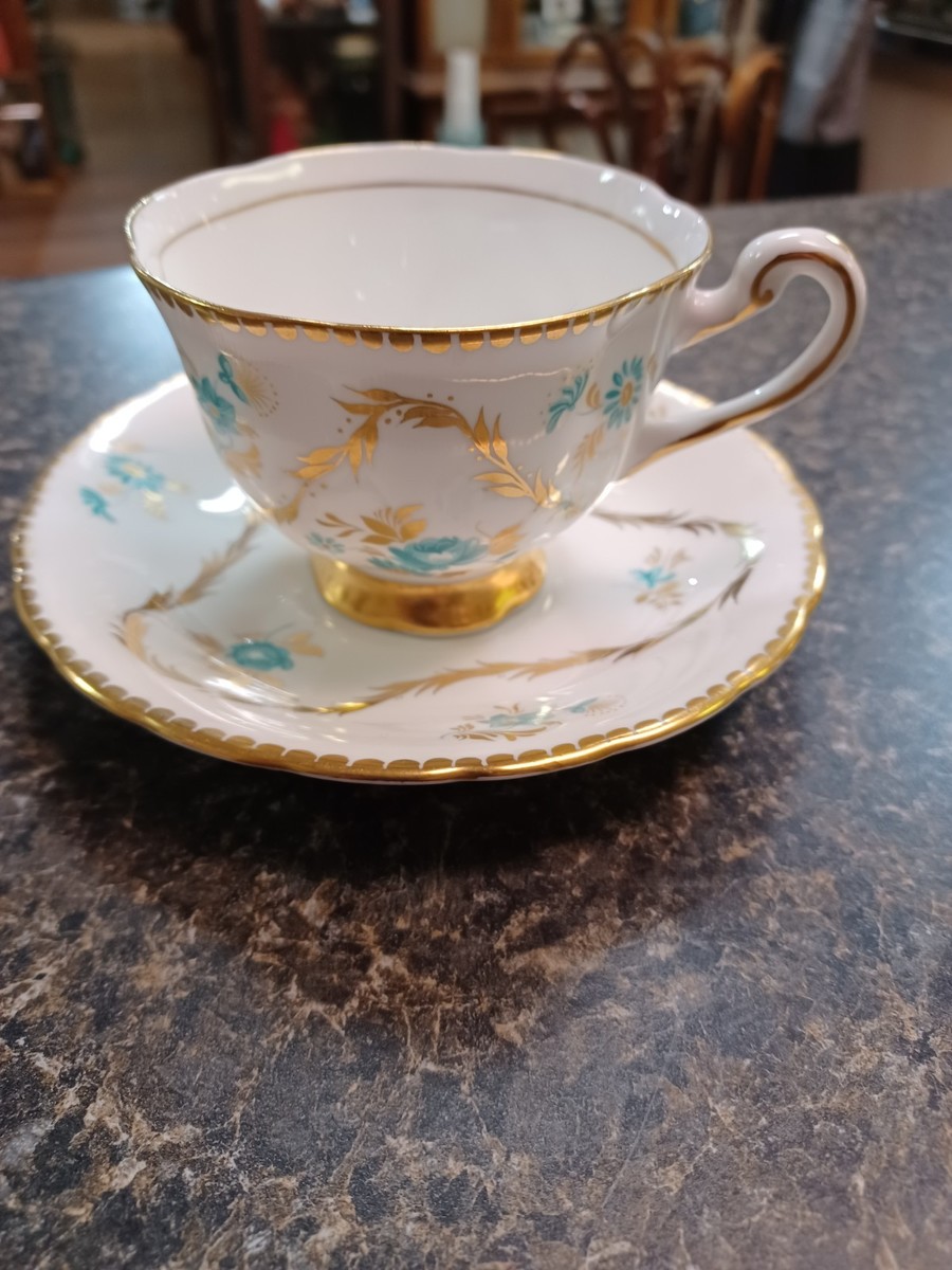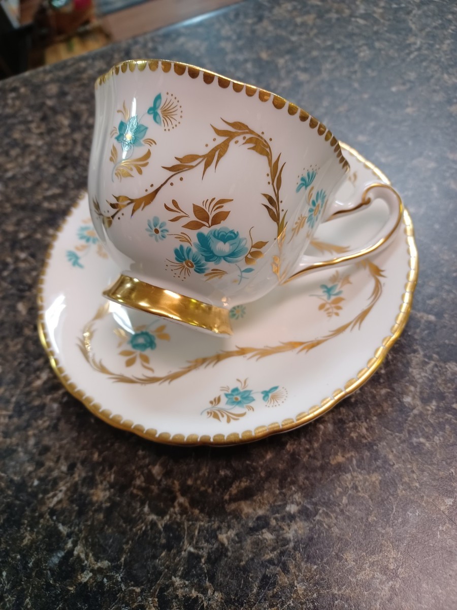 Royal Chelsea Bone China Cup & Saucer Turquoise Gold Rose Garland