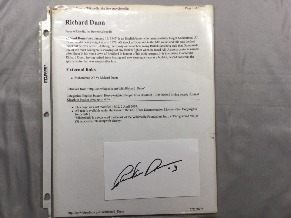 RICHARD DUNN BRITISH BOXER - AUTOGRAPHED CARD 3” X 5” FOUGHT ALI IN 1976
