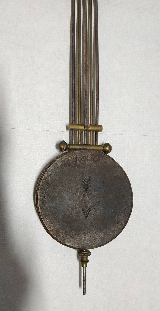 The "R/A" on the pendulum bob means "Slower" and "Faster" (Retard / Advance) indicating the direction to turn the rating nut to regulate the speed of the clock