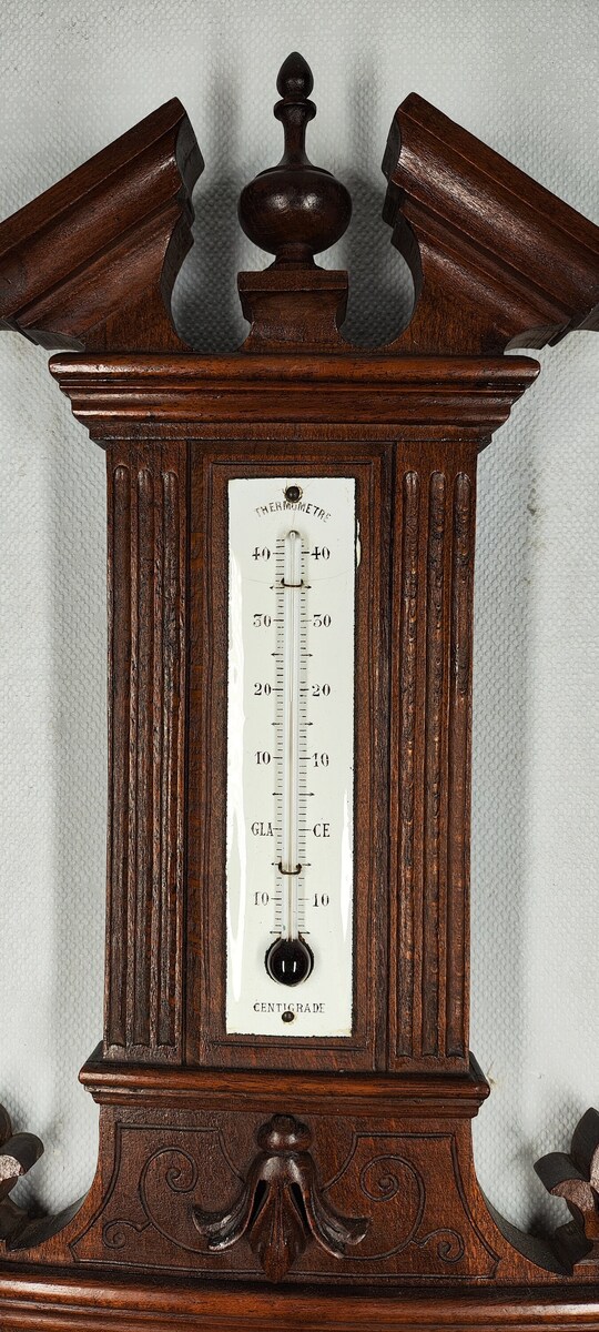 Capture the essence of Belle Époque scientific precision with this stunning French wall-mounted weather station. Crafted in the late 19th to early 20th century, this instrument combines a precise aneroid barometer with a vertical spirit thermometer, housed in a masterfully carved oak or walnut architectural case.