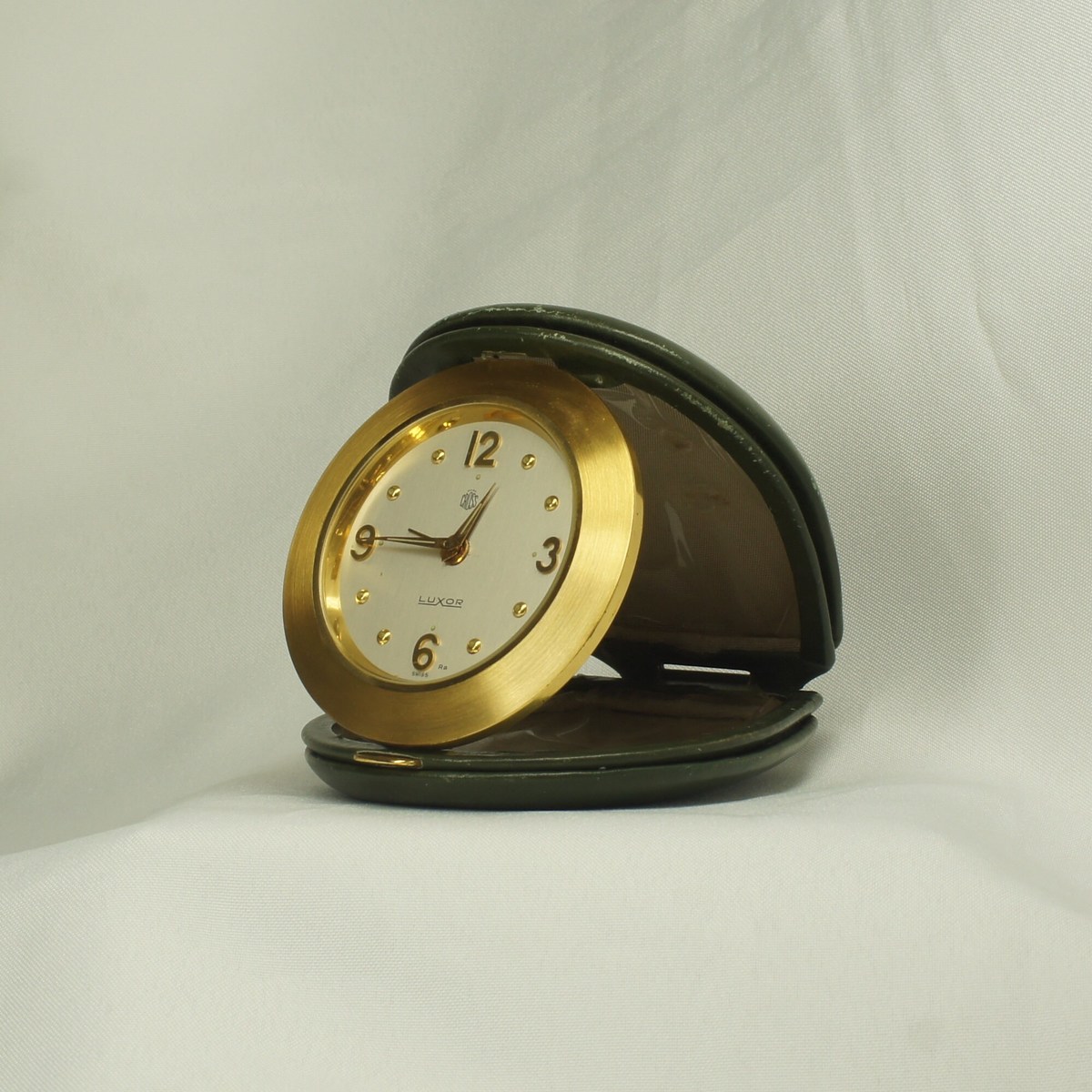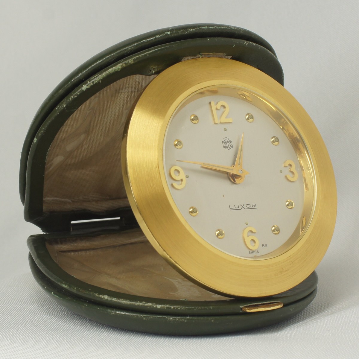 Luxor for Mark Cross travel alarm clock. Polished gilt metal. circular case Brushed silver dial, Gilt and cream alpha hands Gilt alarm hand Arabic numerals at 3, 6, 9 and 12 oclock. Dome hour markers. Hunter-green leather travel case. 8-day mechanical movement clock with 15 jewels. Carries the Luxor and Mark Cross authenticity scripts. In good working order. Origin: Switzerland, late 1960s. Sold as seen.