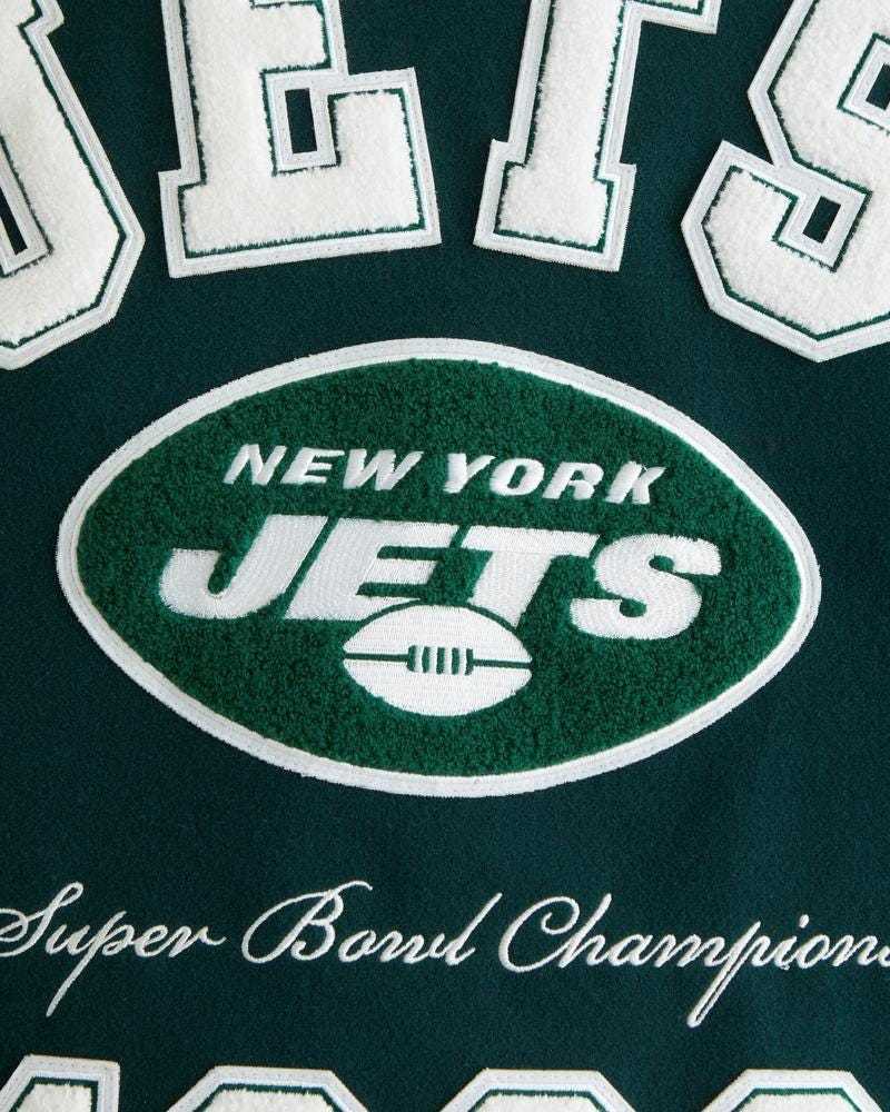 Celebrate one of the most iconic moments in football history with this premium New York Jets Varsity Jacket. This officially licensed collaboration with Abercrombie Fitch pays homage to the Jets' legendary 1968 championship season, blending high-end streetwear aesthetics with authentic NFL heritage.