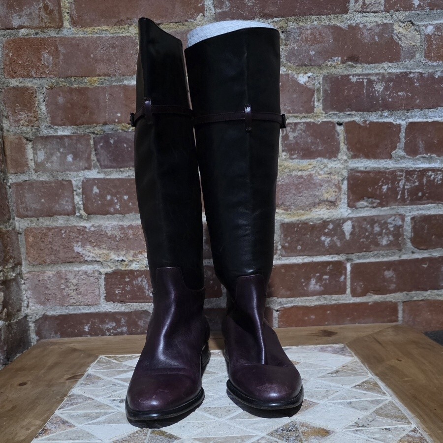 Woman's Via Spiga tall over-the-knee boots in two-tone leather. Plum leather foot and black shaft. Subtle strap detail at the calf. Sleek, equestrian-inspired silhouette.