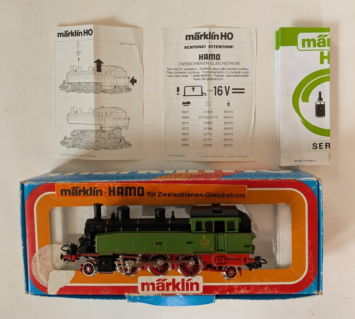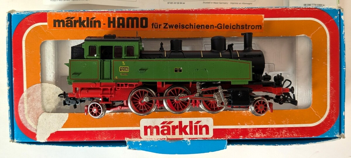 Marklin Marklin-Hamo HO 8312 T5 green steam locomotive used in original box. Analog unit. Very nice for its age, no major scratches. Freshly oiled and tested, works as it should. Includes complete paperwork. Box is fairly scuffed but without major damage.