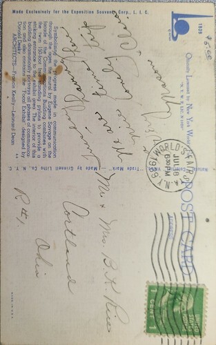 New York World's Fair 1939 Original vintage Postcard -Communications Building. Condition is Used. Has 1 cent George Washington stamp with message hand written on the back. Minor blemish.
