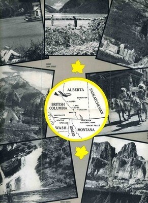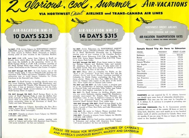 A beautifully illustrated 12 panel fold out brochure. A Northwest Orient and Trans Canada Airlines Air Vacation brochure for Banff, Jasper, and Lake Louise Alberta. Circa 1950s. With photos, travel information, sample fares, vacation itineraries, map and more.