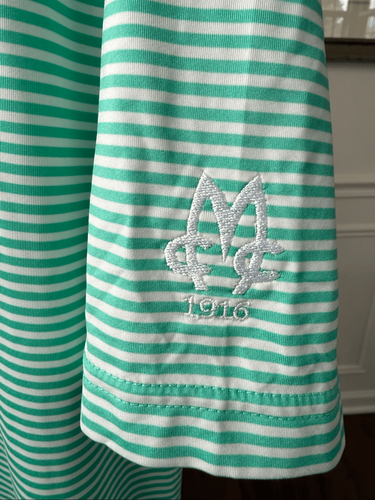 FootJoy green stripe, moisture wicking fabric polo or golf shirt with MCC, Meadowbrook country club, monogram logo at one sleeve. Embroidered FJ at the back neck. Logo buttons. Tag size large. Laying flat measures 30 inches shoulder to hem and 24 inches armpit to armpit