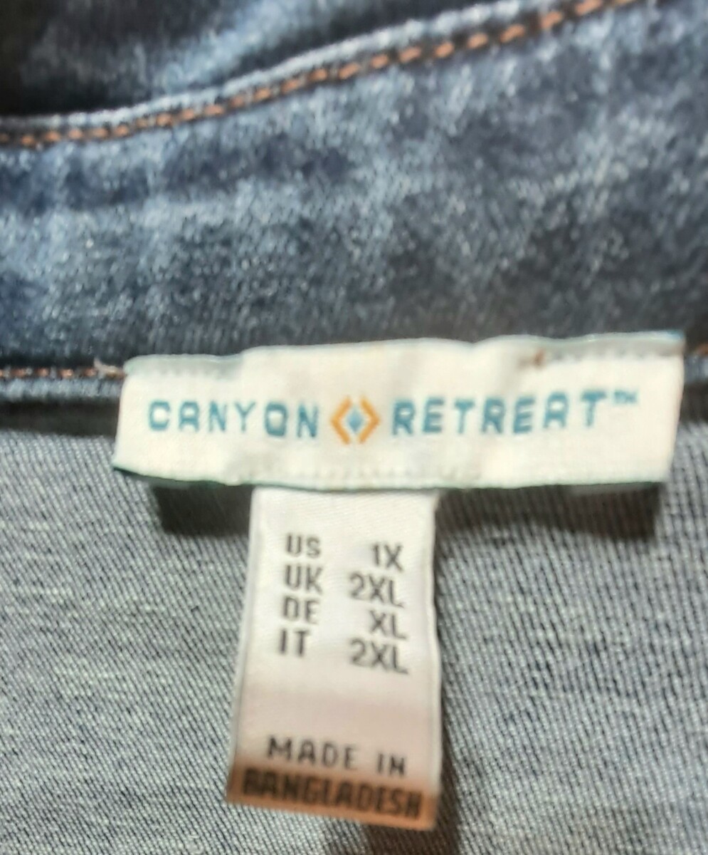 The Canyon Retreat Denim Jacket in size 1X is a stylish and comfortable outerwear option for women. Made by the brand Canyon Retreat, this jacket features a classic blue denim fabric that is both durable and versatile. Perfect for everyday wear or for adding a touch of denim to any outfit, this jacket is a must-have addition to any wardrobe.