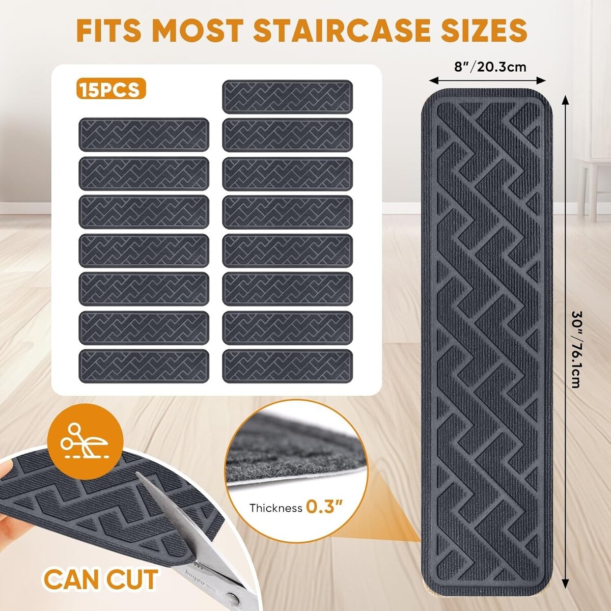 15 Pack 8"x30" Non-Slip Stair Treads – Safe & Comfortable for Kids and Pets