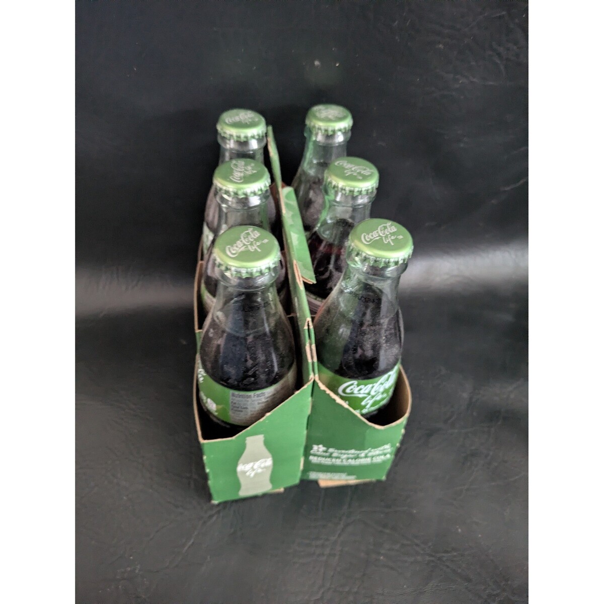 Coca-Cola Life reduced calorie cola comes in a classic 6-pack of 8 fl oz glass bottles, featuring the distinctive green branding associated with this stevia and cane sugar sweetened variety. These collectible glass bottles remain sealed with their original green crown caps and are housed in the original cardboard carrier. Ideal for soda memorabilia collectors or fans of discontinued Coca-Cola variants, this set showcases the unique 'Life' logo and green color palette that set it apart from traditional Coke products. The bottles are full and the carrier shows minimal wear from storage.