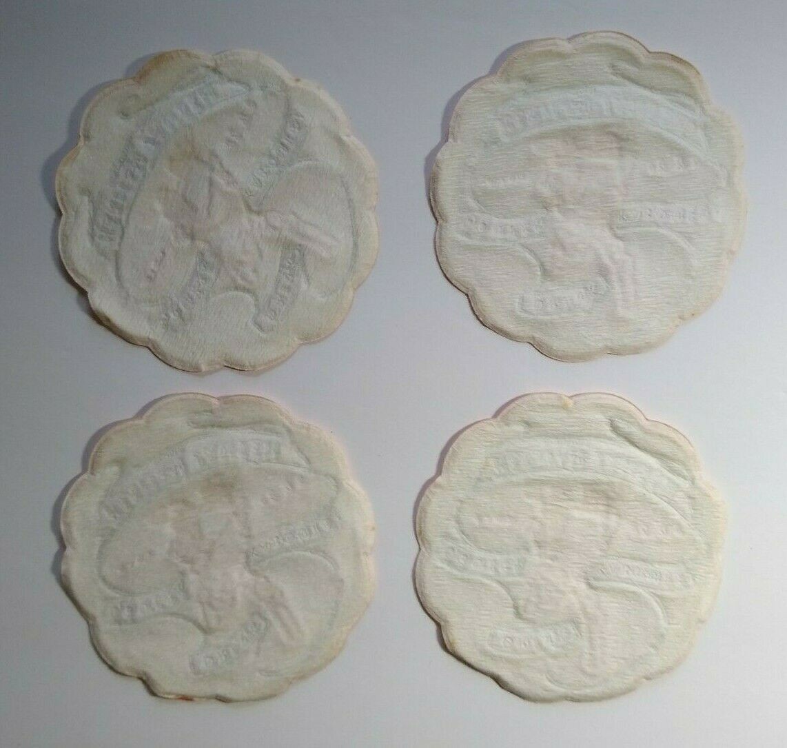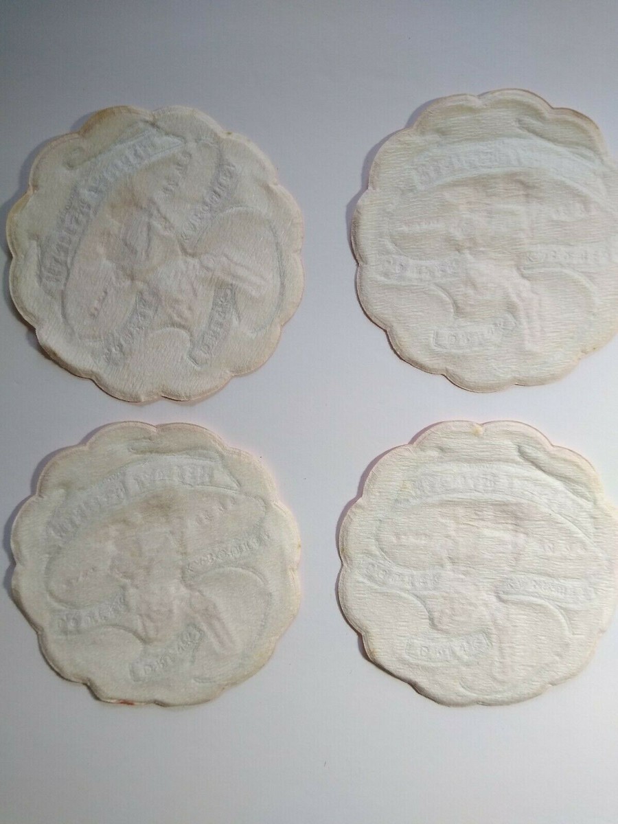 Great looking lot of (4) circa 1950's original fabric drink coasters. New old stock with light age wear to the white but amazing shape. 3.75" size.