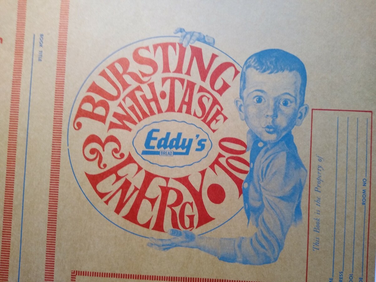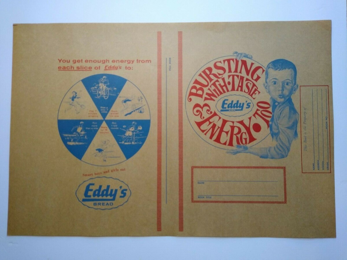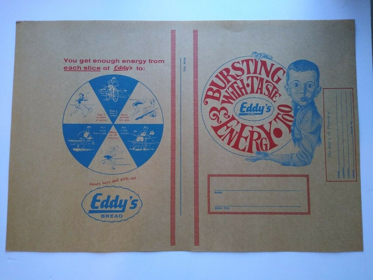 Vintage circa 1950's new old stock bookcover by Eddy's Bread. Size is 12' x 18". Excellent shape.