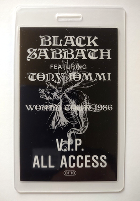 The product is a VIP backstage pass from the original 1986 Black Sabbath tour. This item holds significance for collectors and fans of the band, as it offers a unique and exclusive piece of music memorabilia. The pass features the iconic artwork and branding associated with Black Sabbath, making it a valuable keepsake for those who appreciate the band's influence on rock and pop music history. Produced in the United States, this backstage pass is a rare find for enthusiasts of the legendary band.