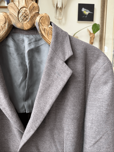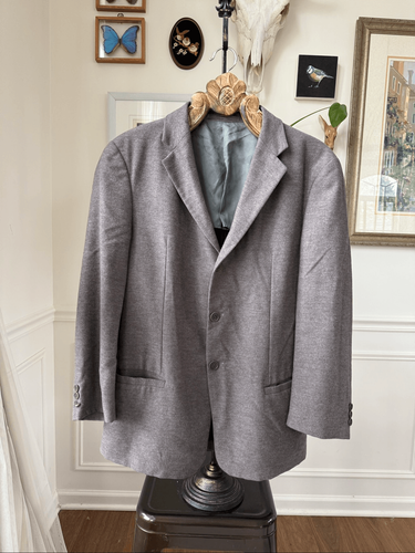 Armani Collezioni three button blazer in gray flannel with notched collar. Partially lined. This is a more casual blazer. The size tag has been removed so please double check measurements to ensure the proper fit for you: 30 inches shoulder to ham, 21 inches armpit two armpits. 19 inches shoulder seem to shoulder seam and 23 inches shoulder seam to cuff.