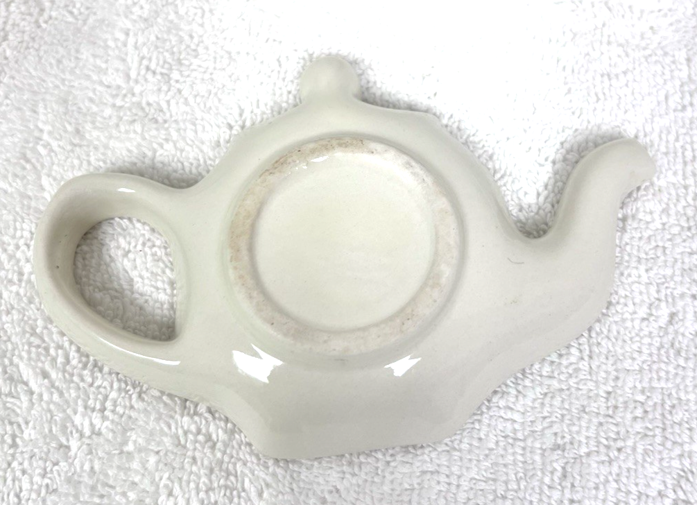 White Ceramic Red Checker Border Tea Bag Drainer Dish Scottish Terrier Scottie Scotty Dog Pattern Teapot Shape measures 5 1/4" wide and 3 1/2" tall/long. Very good condition no signs used...no staining. See pictures.