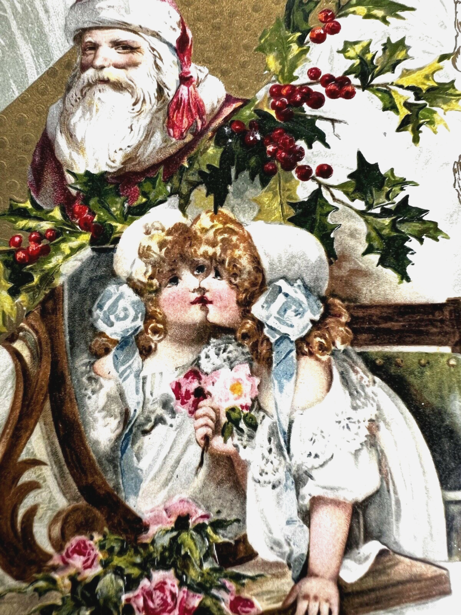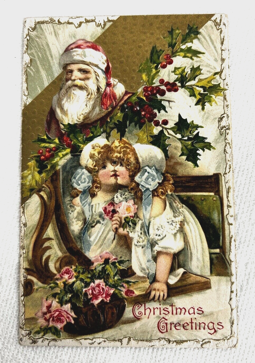 Santa Young Blonde Girl Kissing Mirror Pink Roses Holly Berries Christmas Postcard