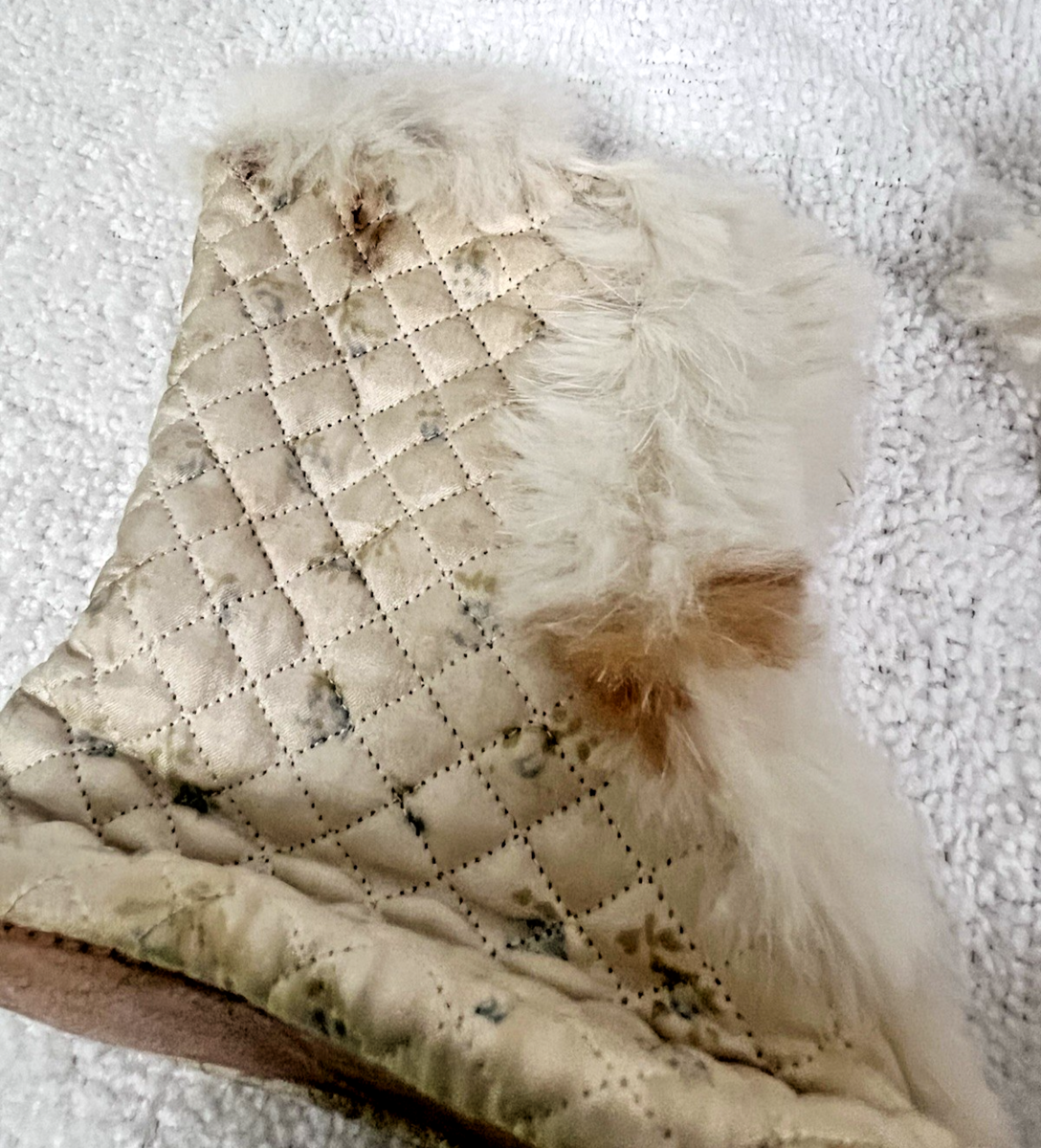 Antique Victorian White Silk Quilted Baby Boots Rabbit Fur Trim Leather Soles
