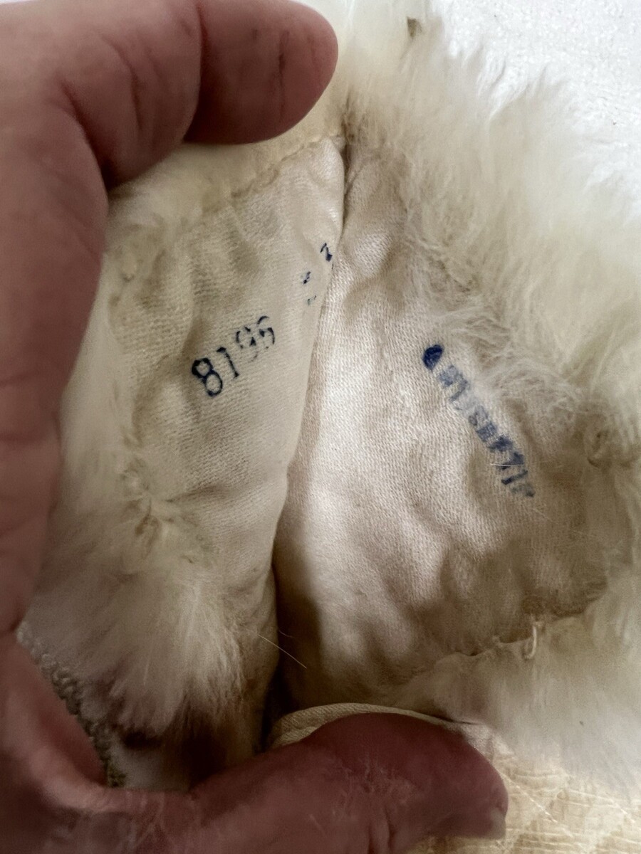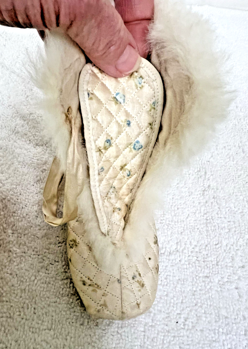 Antique Victorian White Silk Quilted Baby Boots Rabbit Fur Trim Leather Soles. Old quilted fur trim baby booties have leather soles and inside lining stamped makers information but not legible appears European Italy or France maybe, no size indicated but lenth of bootie is approx. 5" long, good used condition, some fading of floral print, ribbon ties not attached on one and another has one ribbon detached inside bootie. See pictures.