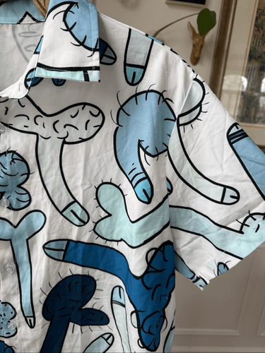 Unbranded, adult humor, short sleeve button up novelty shirt in blue and white. Perfect for a gift or a bachelor party. 100% polyester. Various shades of blue and white. Laying flat measures 30 inches shoulder two ham and 25 inches armpit to armpit