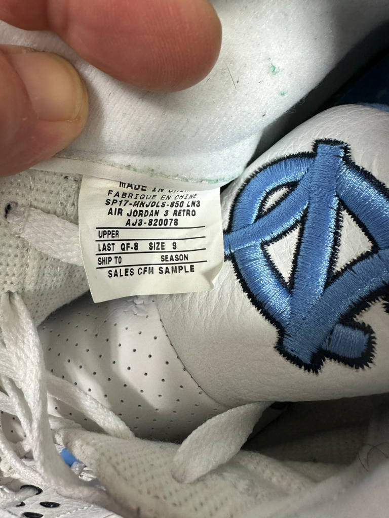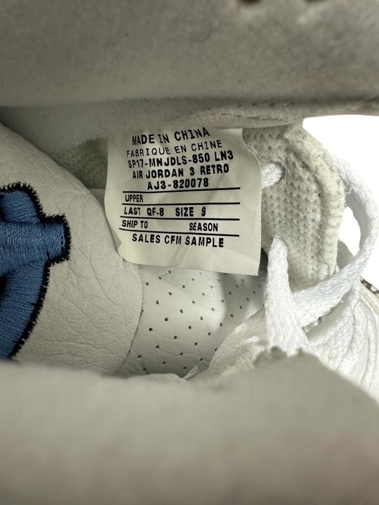 Air Jordan 3 Retro AJ3-820078 PE CFM Sample UNC Football B. Mitchell Box Size 9