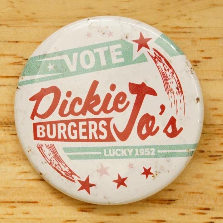 Vintage Pinback Button Eugene Oregon Vote Dickie Jos Burgers Travel Souvenir. Measures 1-3/4" No smoke or pet odor.