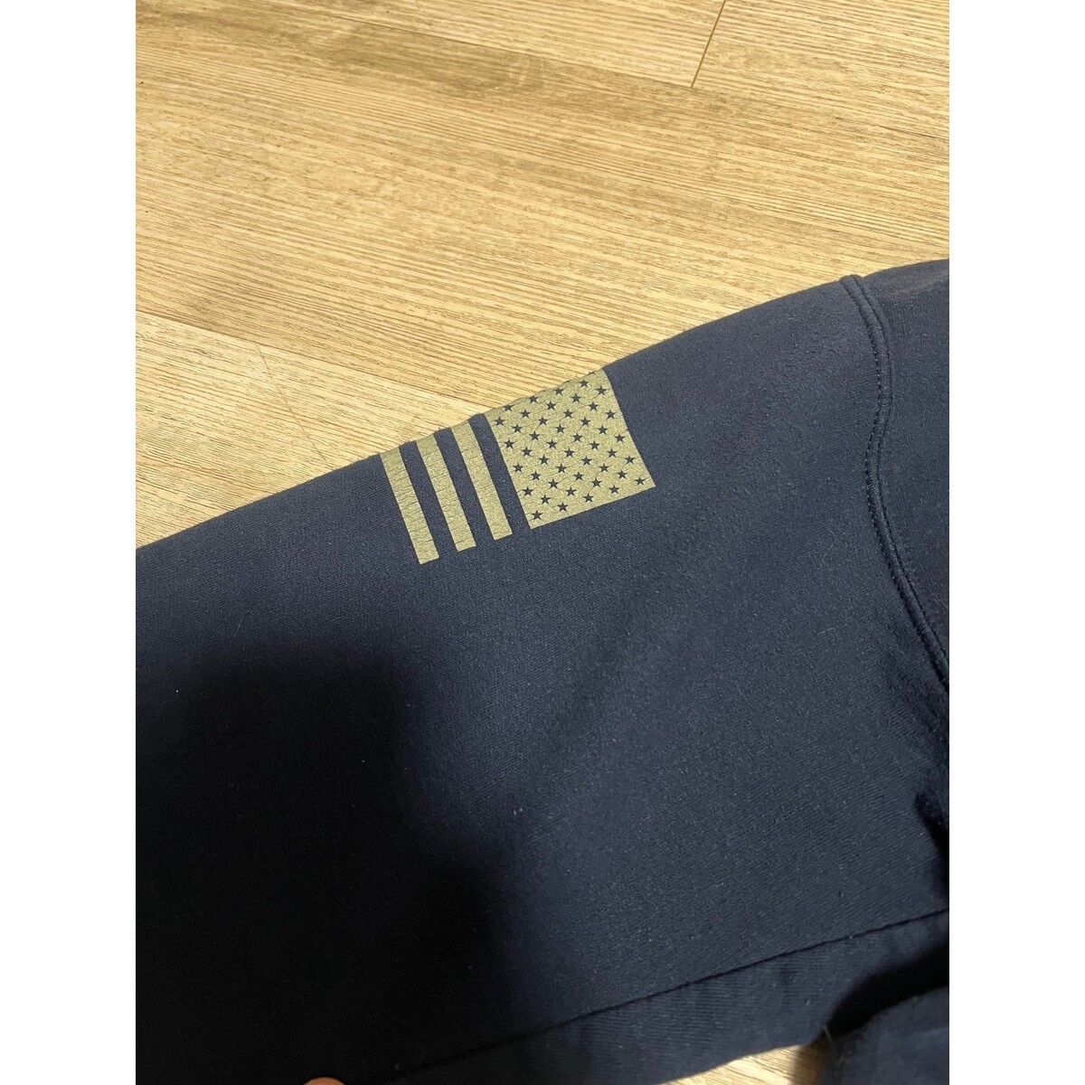 Grunt Style hoodie in navy blue features a patriotic vertical flag graphic on the chest and signature brand graphics on both sleeves. Constructed from a comfortable cotton blend, this pullover includes a front kangaroo pocket and an attached hood. Please note there is a noticeable brown stain on the upper right shoulder area as shown in the photos.