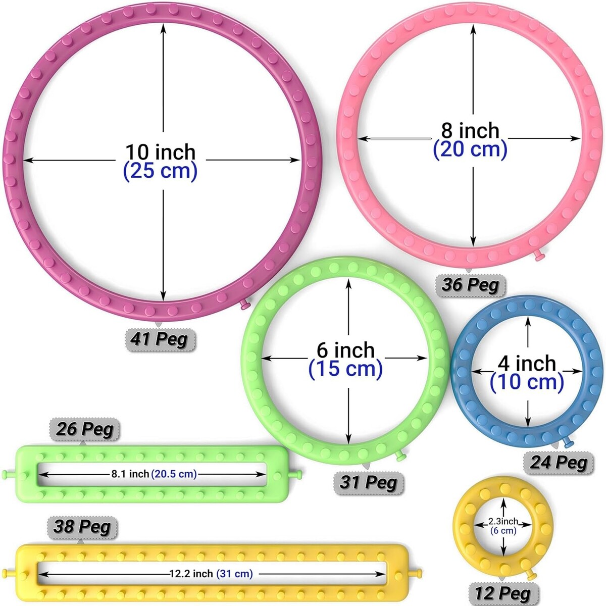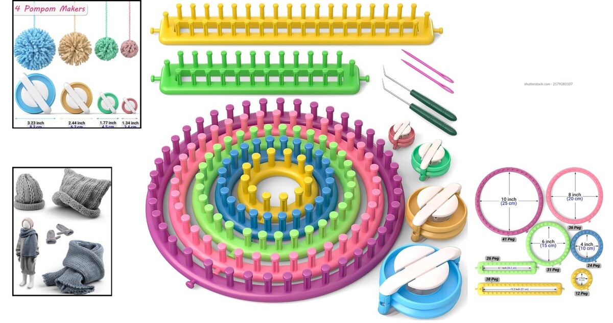 Includes 4 different size knitting looms (5, 7, 9, and 11 inches in diameter) to accommodate various projects.