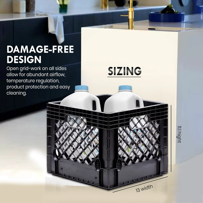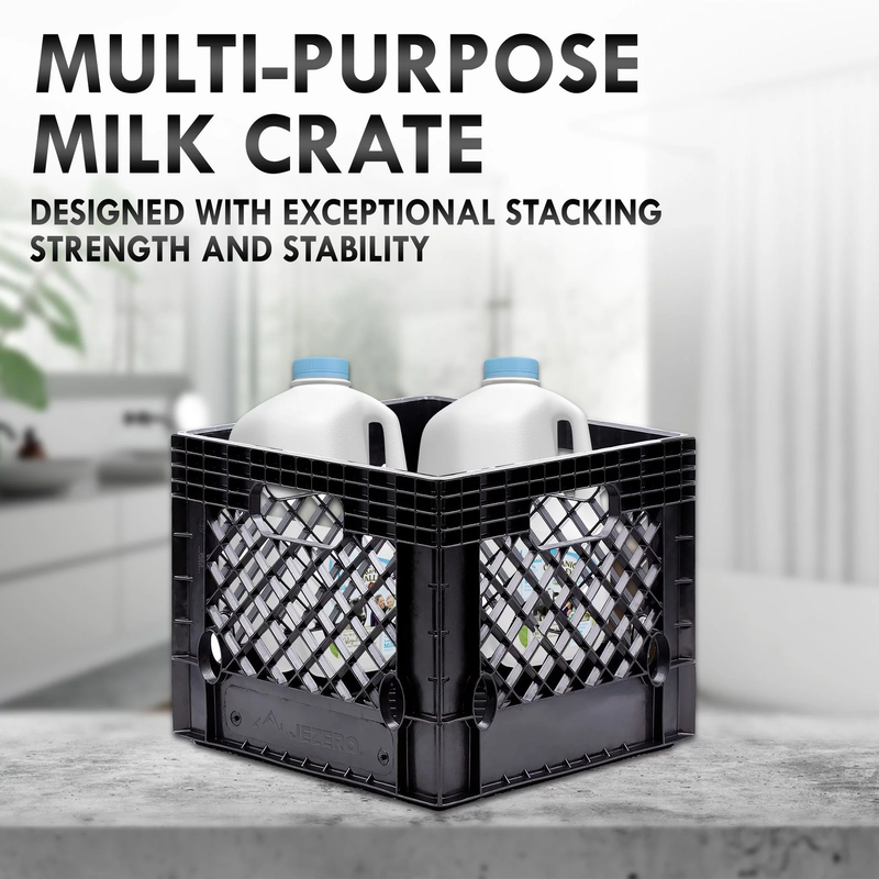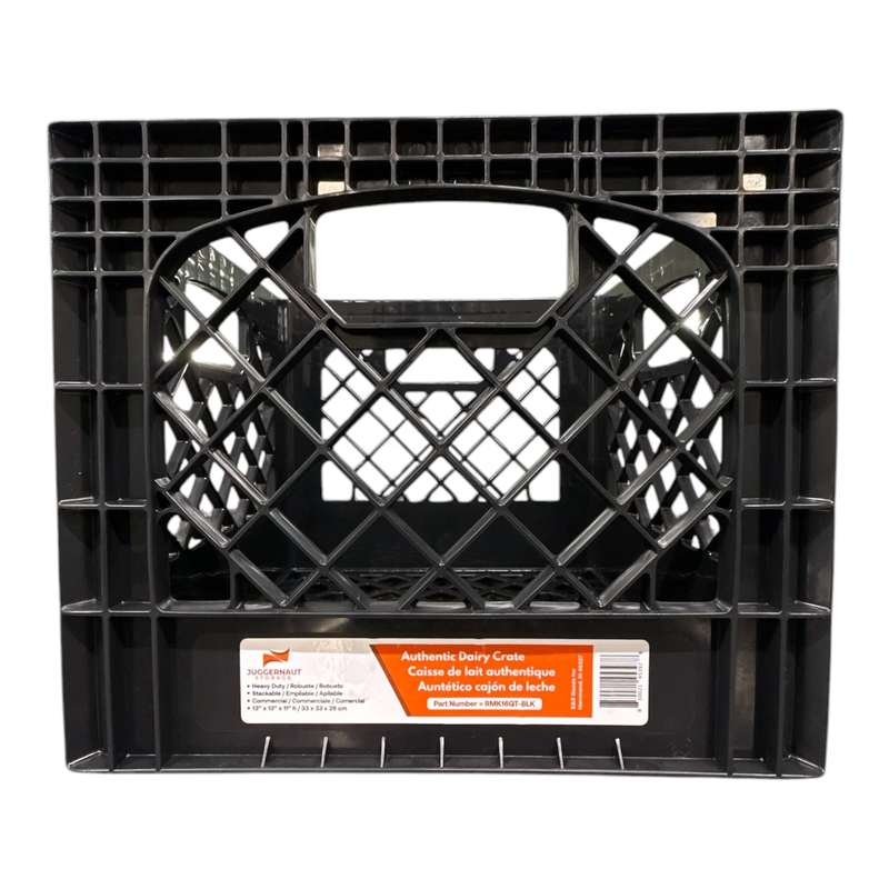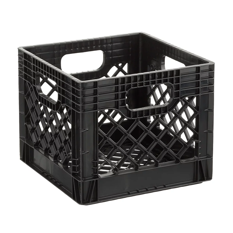 This 16QT plastic black milk crate is great for storing sporting equipment, clothing, holiday accessories, housewares, books, and other odds and ends. The heavy-duty HDPE construction and built-in handles make this crate perfect for hard or heavy items. It features a smooth interior surface, and multiple crates can easily stack on top of each other for an efficient use of vertical space. This heavy-duty dairy/storage crate is a must-have when organizing your home and garage. Use it to store all kinds of small and medium items. Its heavy-duty construction makes it perfect for all your storage needs. Recommended for adults.