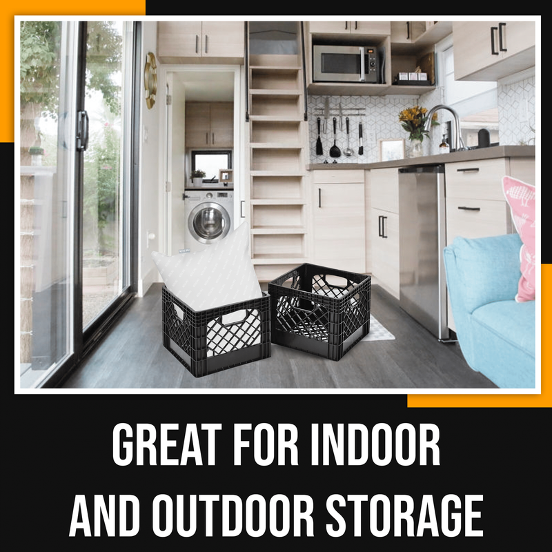 Great for organizing supplies, games and more Very strong heavy-duty construction Great for indoor and outdoor storage . Storage sundries, clothes, fruits, toys and vegetables, etc. So that the cabinets, kitchens, kids rooms are more orderly . Comfortable side handles on crates make heavy lifting a breeze; great for hauling groceries Easy to clean and use Recommended for adults. Inside dimensions are 12 x 12 x 10.5 inches