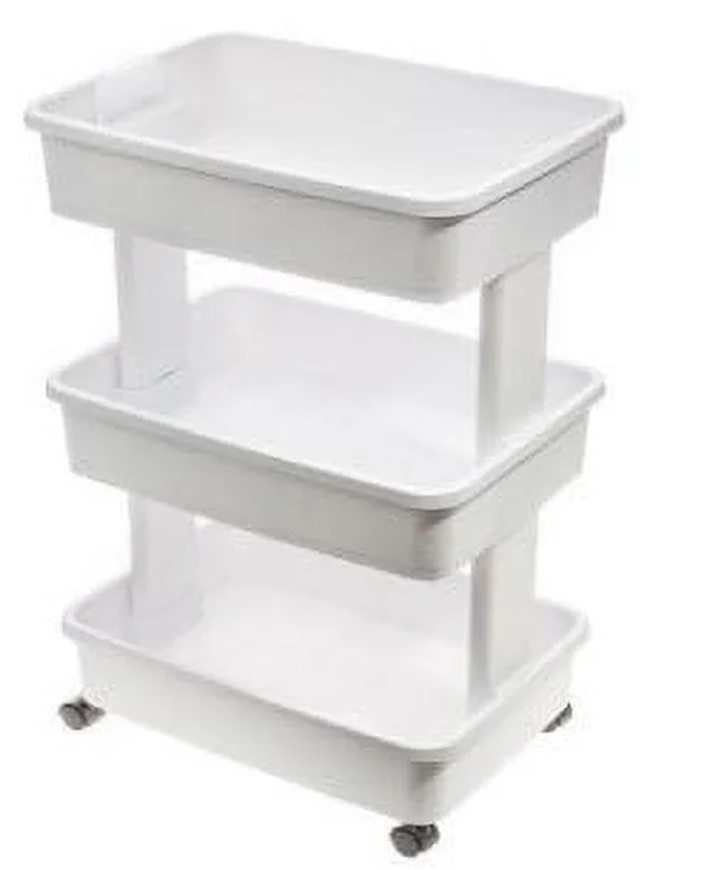 Mainstays 3-Tier Plastic Multi-Purpose Rolling Cart, Arctic White Versatile, convenient rolling cart makes terrific storage and organization solution Sturdy cart includes 3 large, evenly distributed storage bins Stylishly designed to complement any decor Features smooth-rolling casters and lightweight construction for easy movability Ideal for storing laundry, bathroom, craft, or office supplies, or just about anything else Dimensions: 17.3?W x 12.5?D x 27.2?H Assembly required with no tools needed