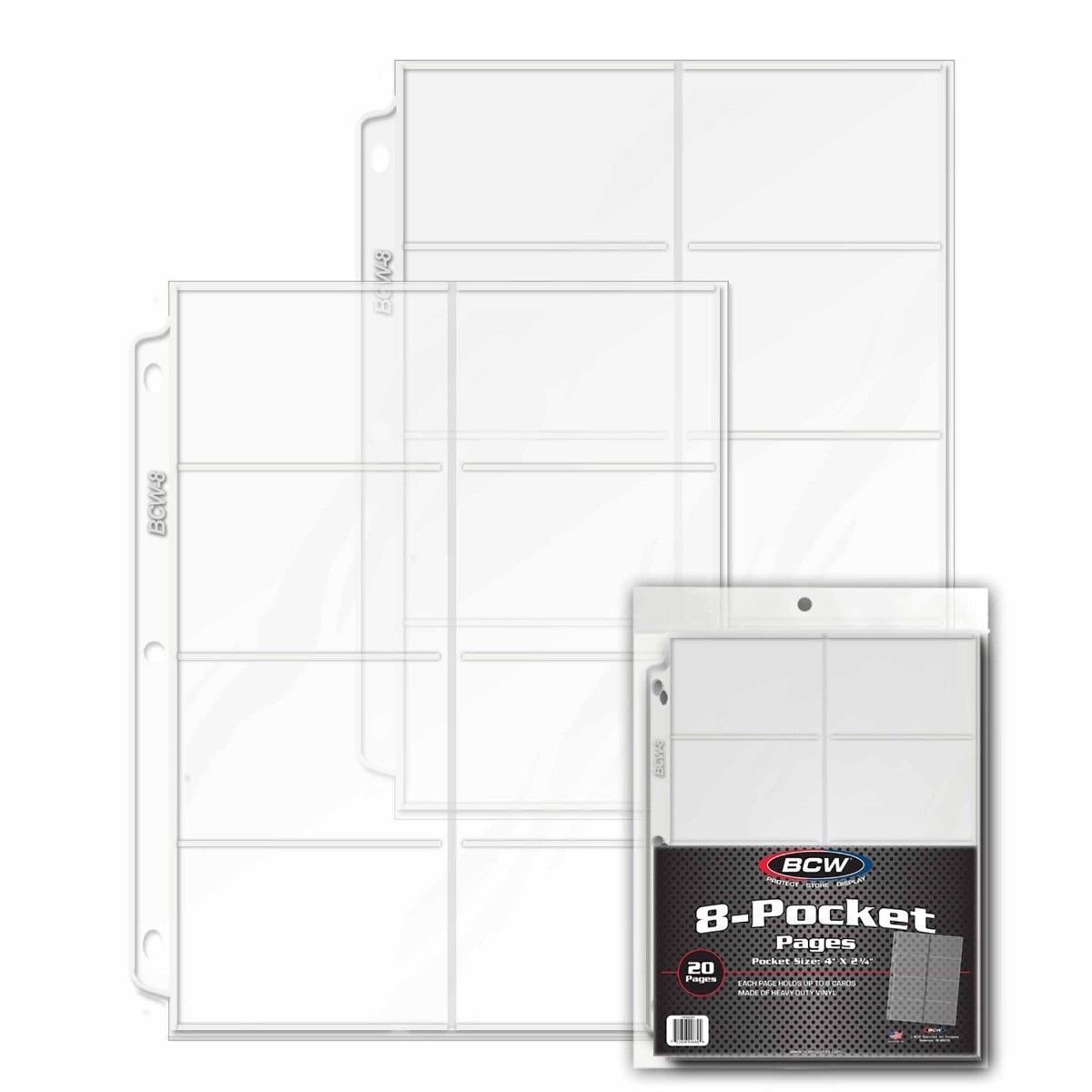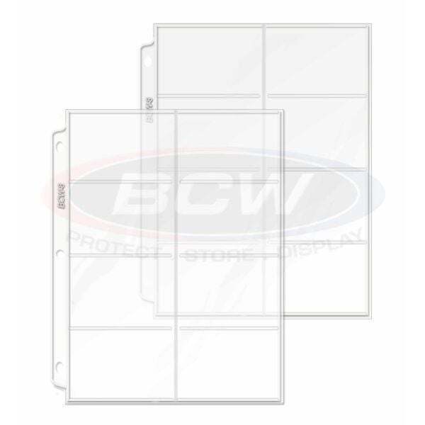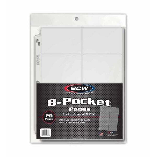 Protect and display your trading card collection with BCW Vinyl 8-Pocket Pages, the ideal solution for organizing pre-1957 trading cards, sports memorabilia, and collectible cards. Designed for serious collectors, these pages hold up to eight cards per page, each measuring 2 ?" x 4", for a total capacity of 160 cards per pack. Whether preserving vintage baseball cards or showcasing a rare Pokemon set, BCW?s high-clarity, Double polished clear vinyl ensures your collection stays safe and visible, enhancing the presentation while providing archival-grade protection.