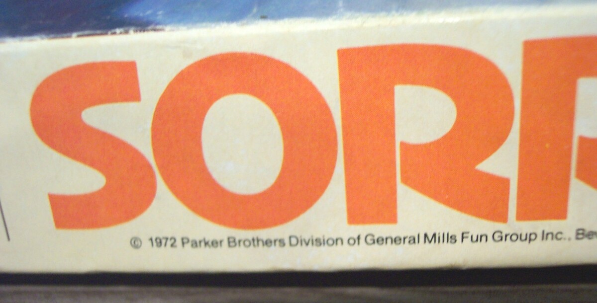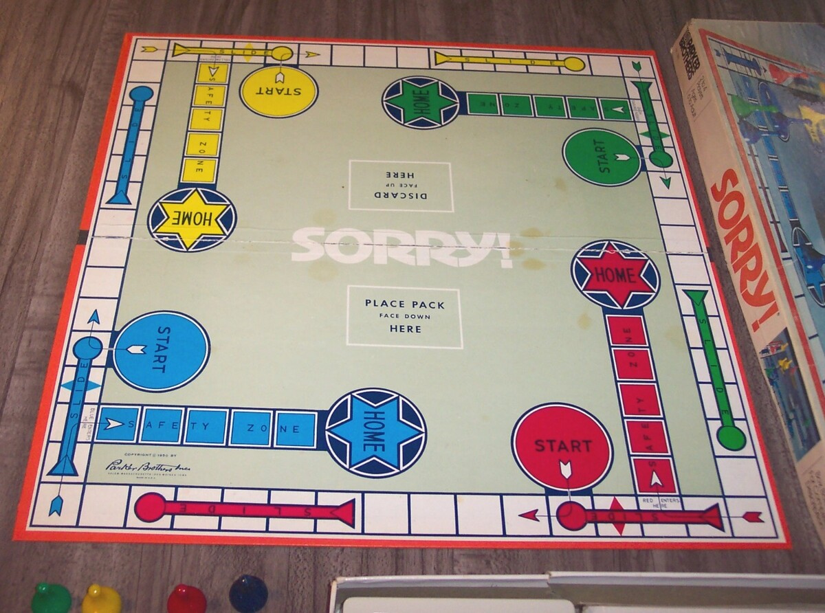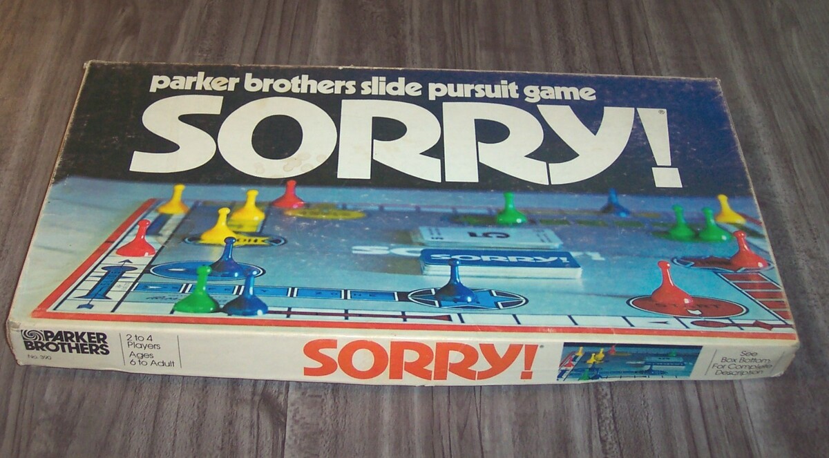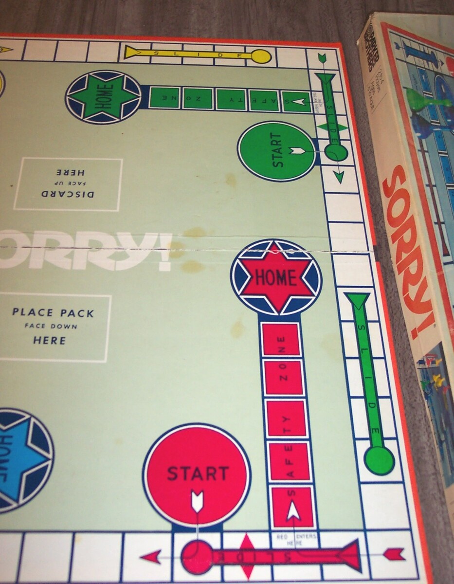 This is a Vintage SORRY Slide Pursuit Game Board Game. Made in 1972 by Parker Brothers. It is in good condition and is complete with the instructions. Box does have some wear from use. Corner of the lid is split. Wear on edges. A little discoloration on the game board. See pictures. . 2-4 Players. Ages 6+ EAG