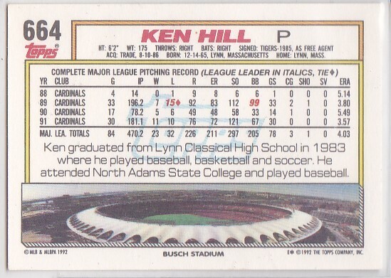 M) 1992 Topps Baseball Trading Card - Ken Hill #664